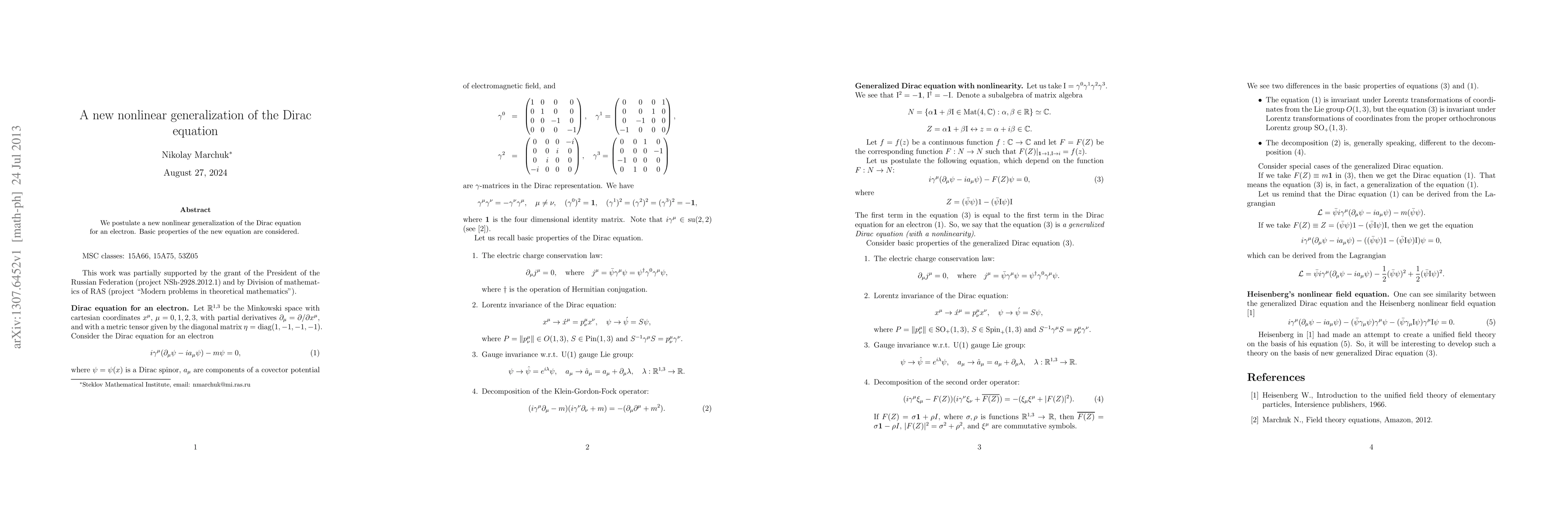The paper presents a new nonlinear generalization of the Dirac equation, preserving essential properties like charge conservation and Lorentz invariance.