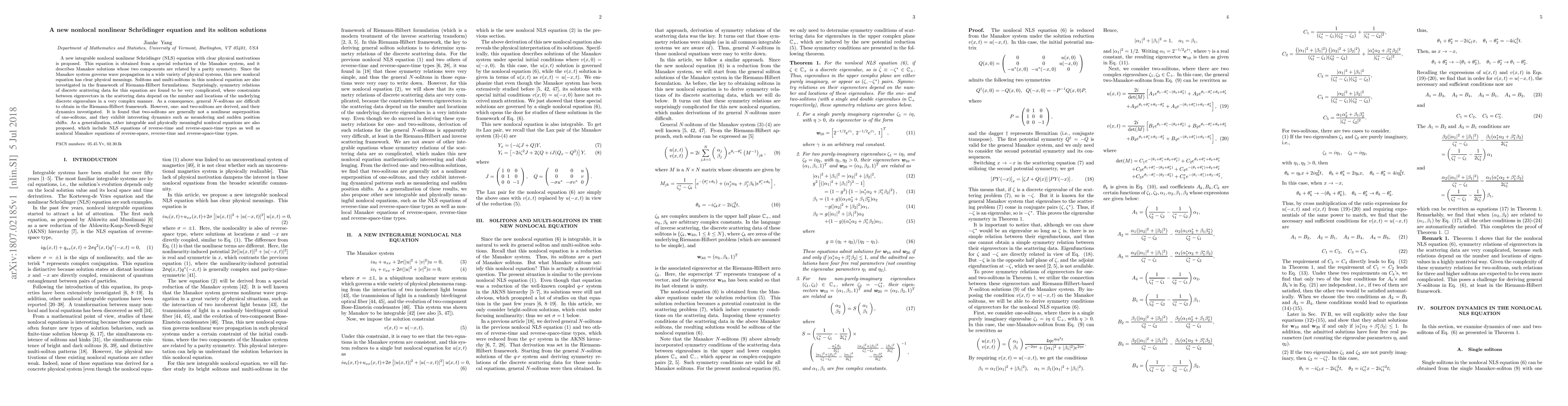 This paper proposes a new integrable nonlocal nonlinear Schrödinger equation derived from the Manakov system, highlighting its physical significance in wave propagation. It investigates soliton solutions, revealing complex symmetry relations and dynamics, particularly noting that two-solitons do not simply superpose and exhibit unique behaviors like meandering and sudden shifts.