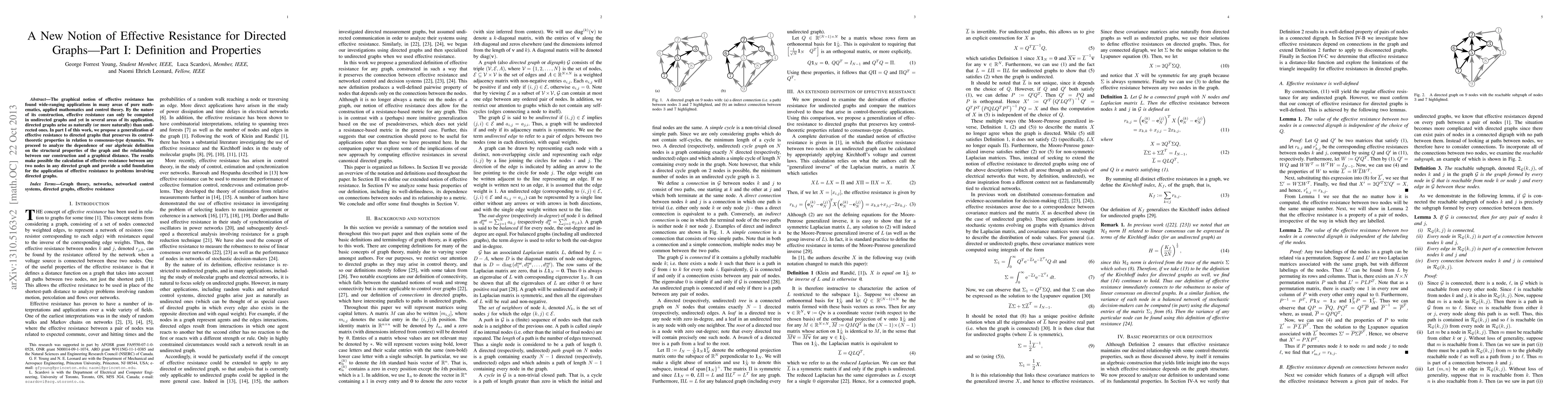 The graphical notion of effective resistance has found wide-ranging applications in many areas of pure mathematics, applied mathematics and control theory. By the nature of its construction, effective resistance can only be computed in undirected graphs and yet in several areas of its application, directed graphs arise as naturally (or more naturally) than undirected ones. In part I of this work, we propose a generalization of effective resistance to directed graphs that preserves its control-theoretic properties in relation to consensus-type dynamics. We proceed to analyze the dependence of our algebraic definition on the structural properties of the graph and the relationship between our construction and a graphical distance. The results make possible the calculation of effective resistance between any two nodes in any directed graph and provide a solid foundation for the application of effective resistance to problems involving directed graphs.