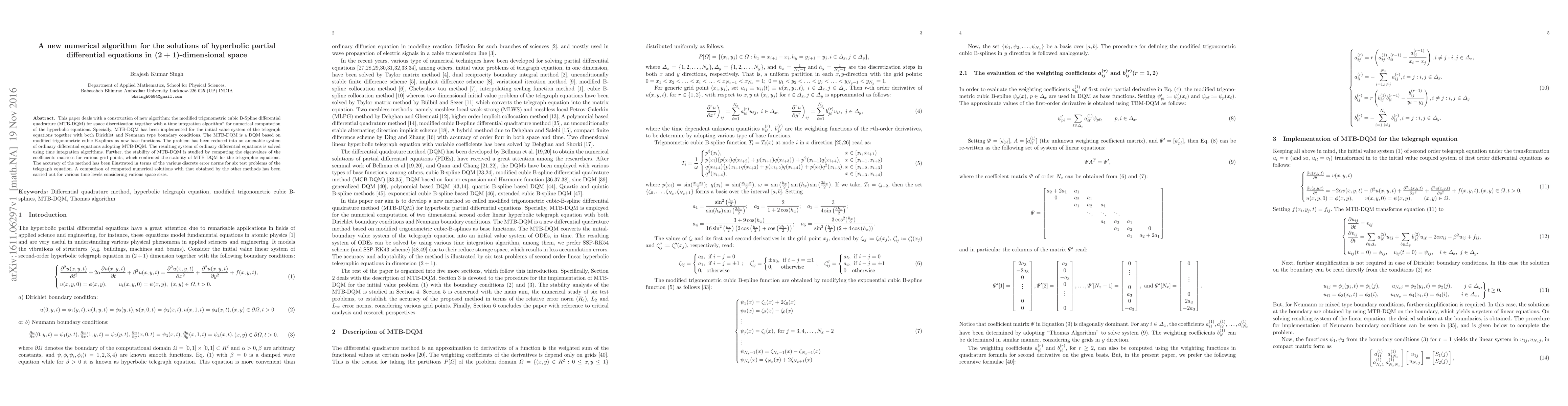 This paper deals with a construction of new algorithm: the modified trigonometric cubic B-Spline differential quadrature (MTB-DQM) for space discretization together with a time integration algorithm" for numerical computation of the hyperbolic equations. Specially, MTB-DQM has been implemented for the initial value system of the telegraph equations together with both Dirichlet and Neumann type boundary conditions. The MTB-DQM is a DQM based on modified trigonometric cubic B-splines as new base functions. The problem has been reduced into an amenable system of ordinary differential equations adopting MTB-DQM. The resulting system of ordinary differential equations is solved using time integration algorithms. Further, the stability of MTB-DQM is studied by computing the eigenvalues of the coefficients matrices for various grid points, which confirmed the stability of MTB-DQM for the telegraphic equations. The accuracy of the method has been illustrated in terms of the various discrete error norms for six test problems of the telegraph equation. A comparison of computed numerical solutions with that obtained by the other methods has been carried out for various time levels considering various space sizes