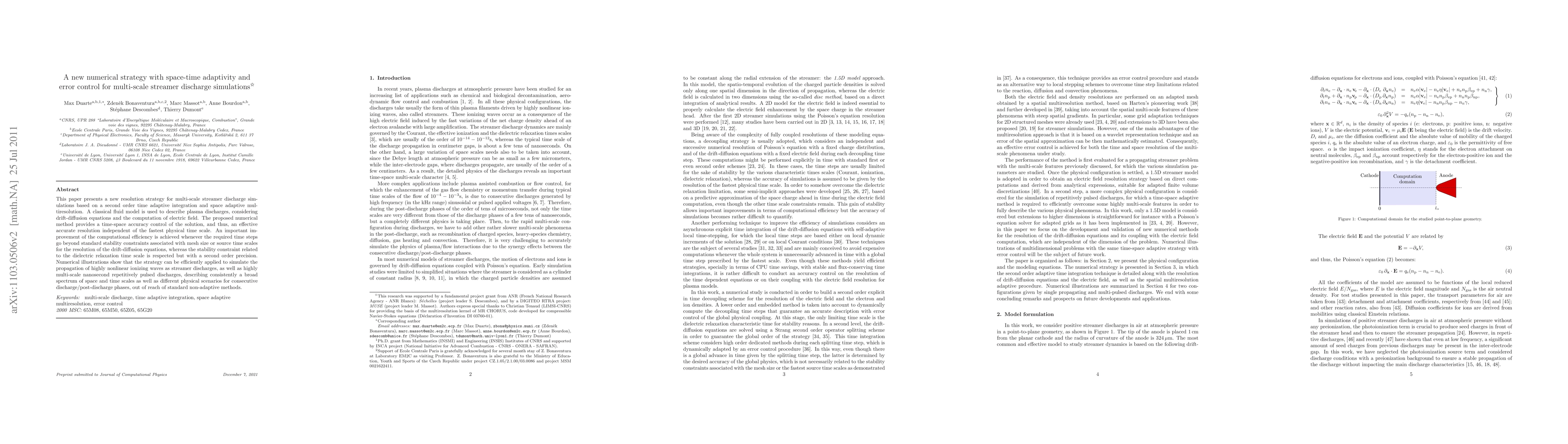 This paper presents a new resolution strategy for multi-scale streamer discharge simulations based on a second order time adaptive integration and space adaptive multiresolution. A classical fluid model is used to describe plasma discharges, considering drift-diffusion equations and the computation of electric field. The proposed numerical method provides a time-space accuracy control of the solution, and thus, an effective accurate resolution independent of the fastest physical time scale. An important improvement of the computational efficiency is achieved whenever the required time steps go beyond standard stability constraints associated with mesh size or source time scales for the resolution of the drift-diffusion equations, whereas the stability constraint related to the dielectric relaxation time scale is respected but with a second order precision. Numerical illustrations show that the strategy can be efficiently applied to simulate the propagation of highly nonlinear ionizing waves as streamer discharges, as well as highly multi-scale nanosecond repetitively pulsed discharges, describing consistently a broad spectrum of space and time scales as well as different physical scenarios for consecutive discharge/post-discharge phases, out of reach of standard non-adaptive methods.