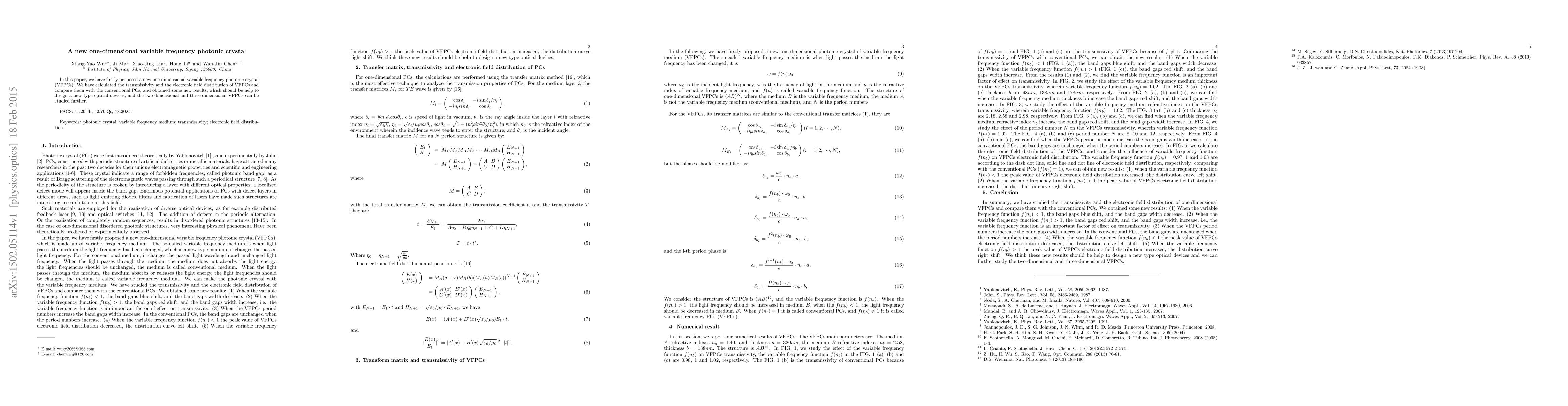 In this paper, we have firstly proposed a new one-dimensional variable frequency photonic crystals (VFPCs). We have calculated the transmissivity and the electronic field distribution of VFPCs and compare them with the conventional PCs, and obtained some new results, which should be help to design a new type optical devices, and the two-dimensional and three-dimensional VFPCs can be studied further.