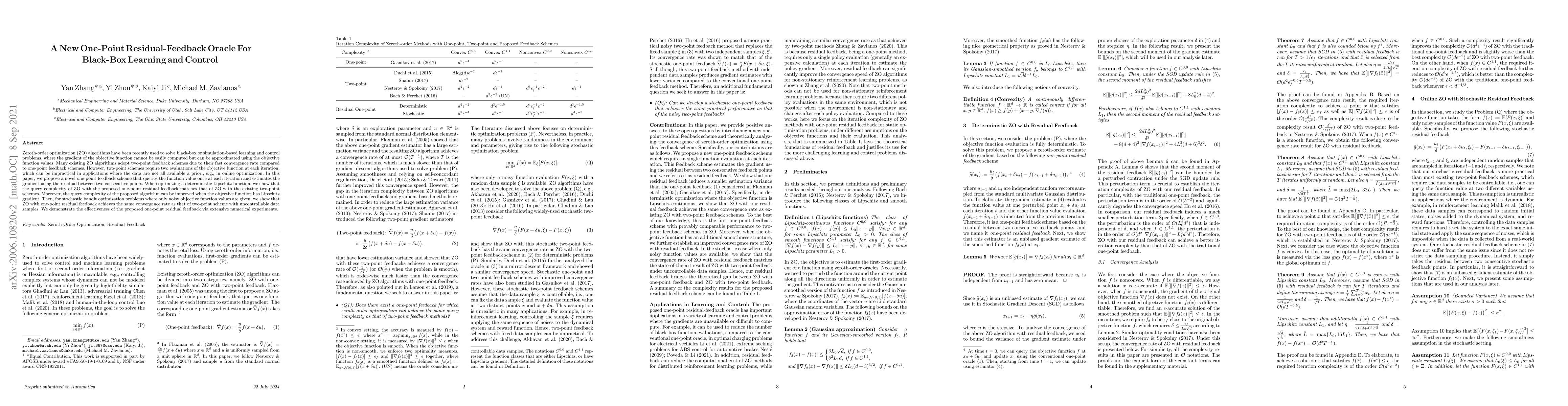 This paper introduces a new one-point residual-feedback scheme for zeroth-order optimization in black-box learning and control, which approximates gradients using function values without requiring multiple evaluations. The proposed method matches the query complexity of existing two-point schemes and can further improve efficiency with Lipschitz gradient functions, proving effective in both deterministic and stochastic optimization scenarios.