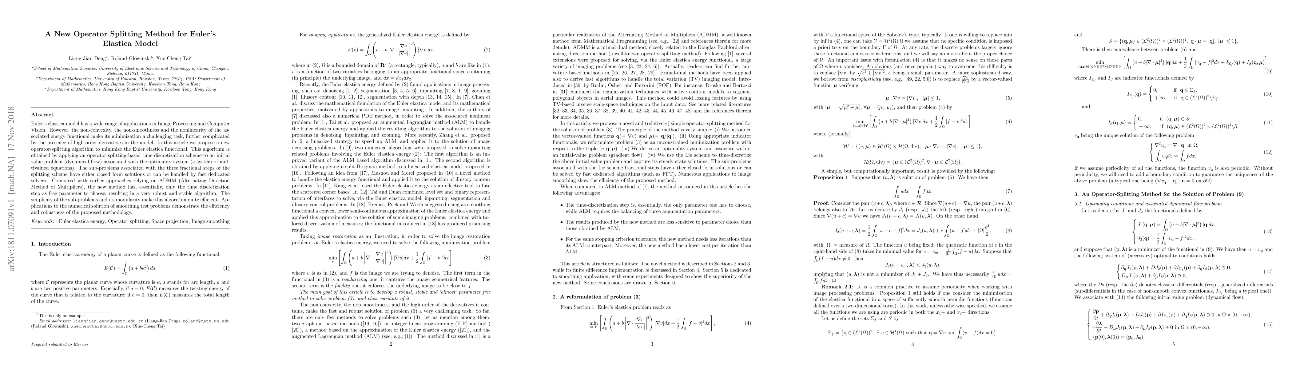 Euler's elastica model has a wide range of applications in Image Processing and Computer Vision. However, the non-convexity, the non-smoothness and the nonlinearity of the associated energy functional make its minimization a challenging task, further complicated by the presence of high order derivatives in the model. In this article we propose a new operator-splitting algorithm to minimize the Euler elastica functional. This algorithm is obtained by applying an operator-splitting based time discretization scheme to an initial value problem (dynamical flow) associated with the optimality system (a system of multivalued equations). The sub-problems associated with the three fractional steps of the splitting scheme have either closed form solutions or can be handled by fast dedicated solvers. Compared with earlier approaches relying on ADMM (Alternating Direction Method of Multipliers), the new method has, essentially, only the time discretization step as free parameter to choose, resulting in a very robust and stable algorithm. The simplicity of the sub-problems and its modularity make this algorithm quite efficient. Applications to the numerical solution of smoothing test problems demonstrate the efficiency and robustness of the proposed methodology.