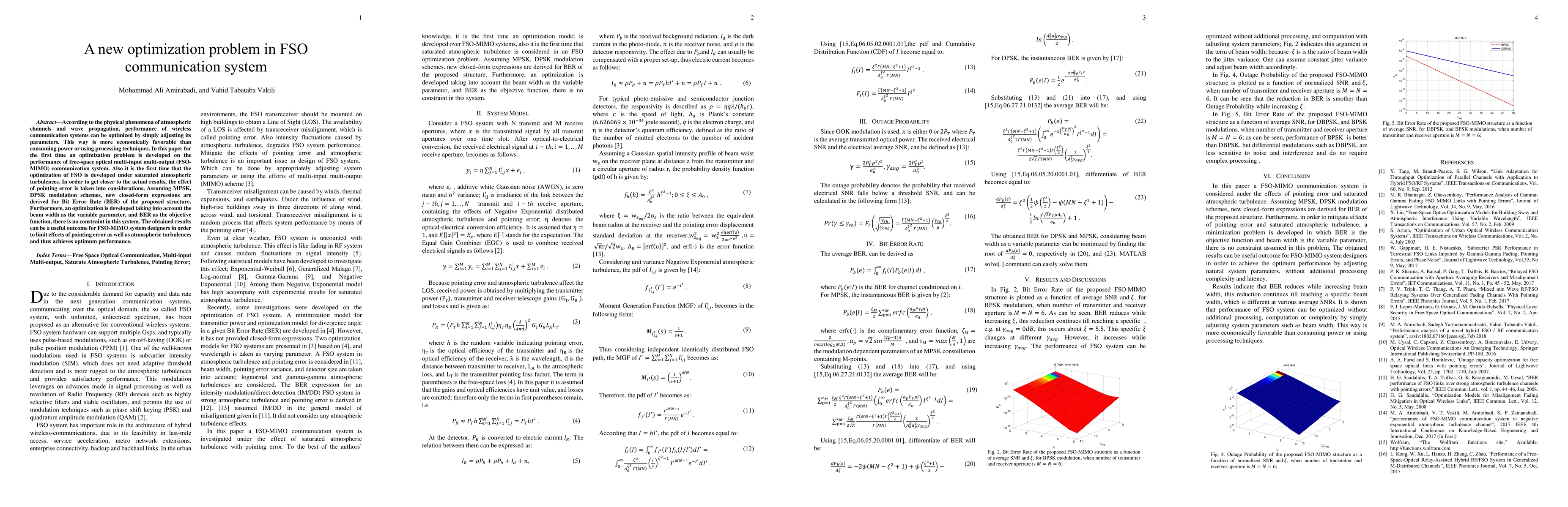 According to the physical phenomena of atmospheric channels and wave propagation, performance of wireless communication systems can be optimized by simply adjusting its parameters. This way is more economically favorable than consuming power or using processing techniques. In this paper for the first time an optimization problem is developed on the performance of free-space optical multi-input multi-output (FSO-MIMO) communication system. Also it is the first time that the optimization of FSO is developed under saturated atmospheric turbulences. In order to get closer to the actual results, the effect of pointing error is taken into considerations. Assuming MPSK, DPSK modulation schemes, new closed-form expressions are derived for Bit Error Rate (BER) of the proposed structure. Furthermore, an optimization is developed taking into account the beam width as the variable parameter, and BER as the objective function, there is no constraint in this system. The obtained results can be a useful outcome for FSO-MIMO system designers in order to limit effects of pointing error as well as atmospheric turbulences and thus achieves optimum performance.