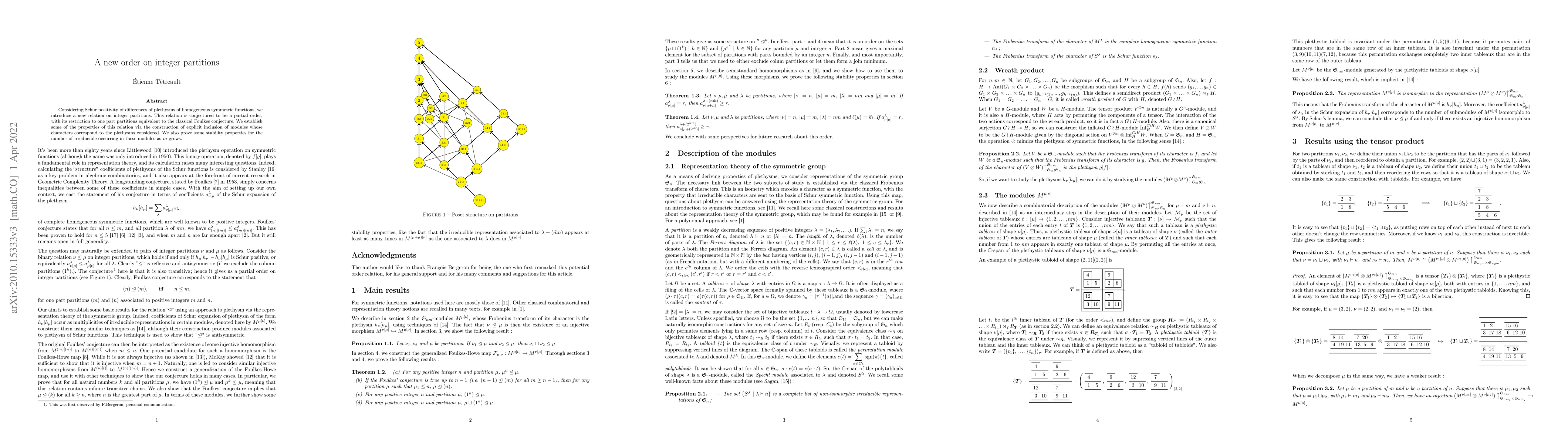 Considering Schur positivity of differences of plethysms of homogeneous symmetric functions, we introduce a new relation on integer partitions. This relation is conjectured to be a partial order, with its restriction to one part partitions equivalent to the classical Foulkes conjecture. We establish some of the properties of this relation via the construction of explicit inclusion of modules whose characters correspond to the plethysms considered. We also prove some stability properties for the number of irreducible occurring in these modules as $n$ grows.