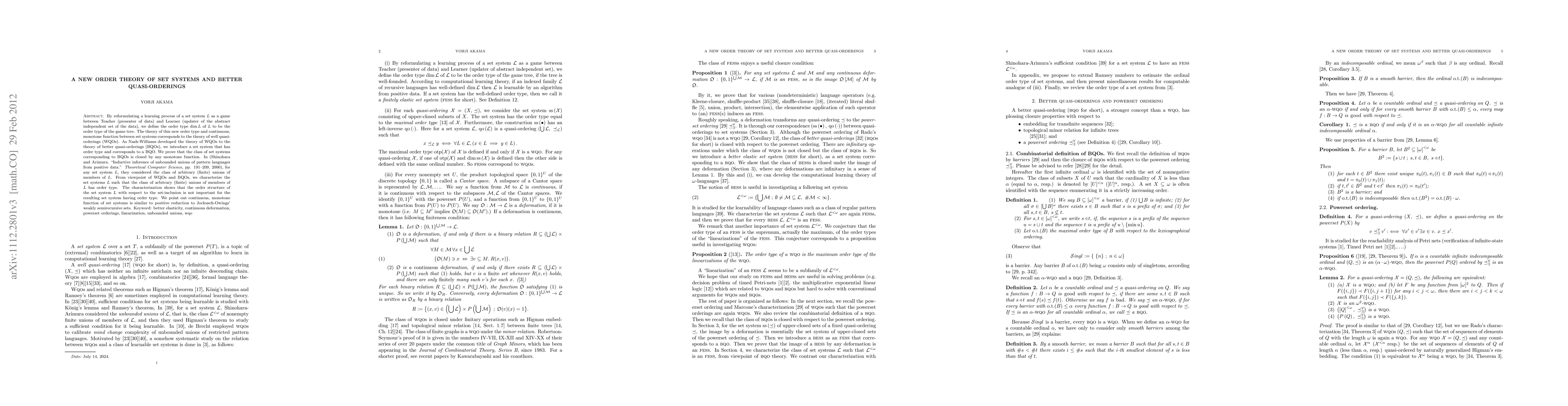 By reformulating a learning process of a set system L as a game between Teacher (presenter of data) and Learner (updater of the abstract independent set), we define the order type dim L of L to be the order type of the game tree. The theory of this new order type and continuous, monotone function between set systems corresponds to the theory of well quasi-orderings (WQOs). As Nash-Williams developed the theory of WQOs to the theory of better quasi-orderings (BQOs), we introduce a set system that has order type and corresponds to a BQO. We prove that the class of set systems corresponding to BQOs is closed by any monotone function. In (Shinohara and Arimura. "Inductive inference of unbounded unions of pattern languages from positive data." Theoretical Computer Science, pp. 191-209, 2000), for any set system L, they considered the class of arbitrary (finite) unions of members of L. From viewpoint of WQOs and BQOs, we characterize the set systems L such that the class of arbitrary (finite) unions of members of L has order type. The characterization shows that the order structure of the set system L with respect to the set-inclusion is not important for the resulting set system having order type. We point out continuous, monotone function of set systems is similar to positive reduction to Jockusch-Owings' weakly semirecursive sets.
