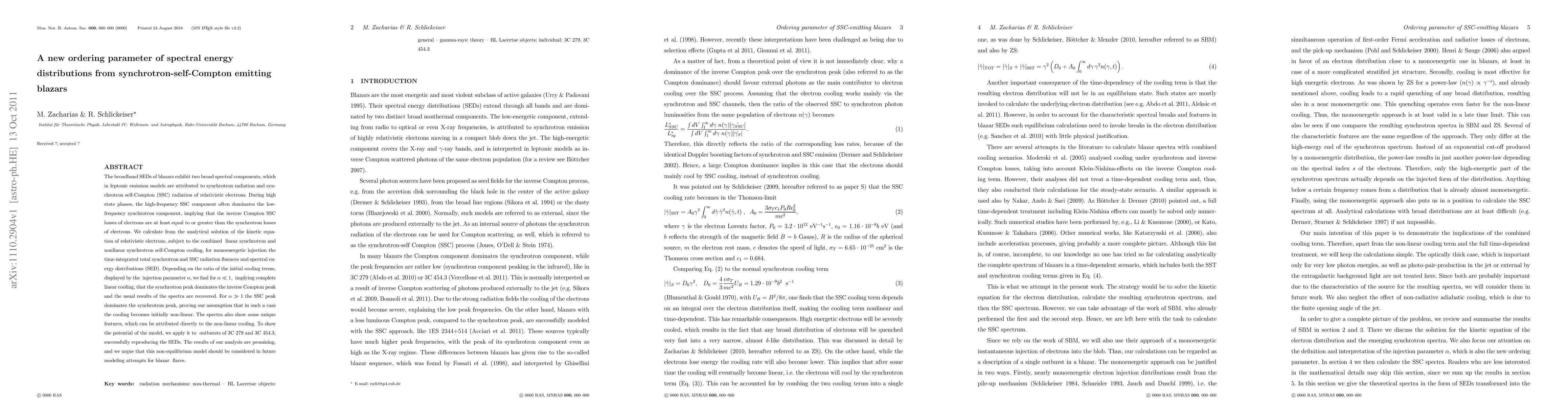 This paper introduces a new ordering parameter to analyze the spectral energy distributions (SEDs) of synchrotron-self-Compton emitting blazars, showing that the dominance of the SSC peak over the synchrotron peak indicates non-linear cooling processes. The model successfully reproduces the SEDs of blazars 3C 279 and 3C 454.3, suggesting its utility in future blazar flare studies.