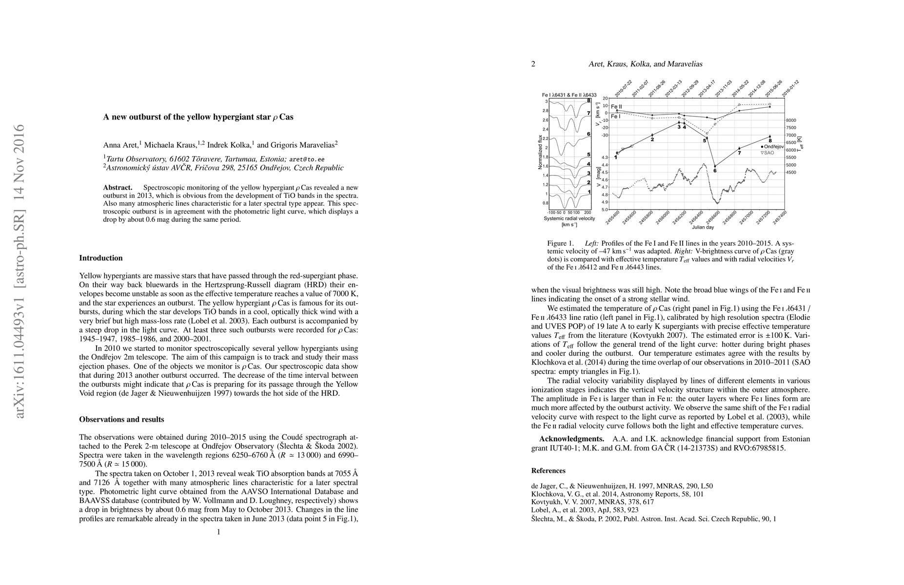 A yellow hypergiant star $ ho$ Cas experienced a new outburst in 2013, marked by changes in its spectrum and light curve.
