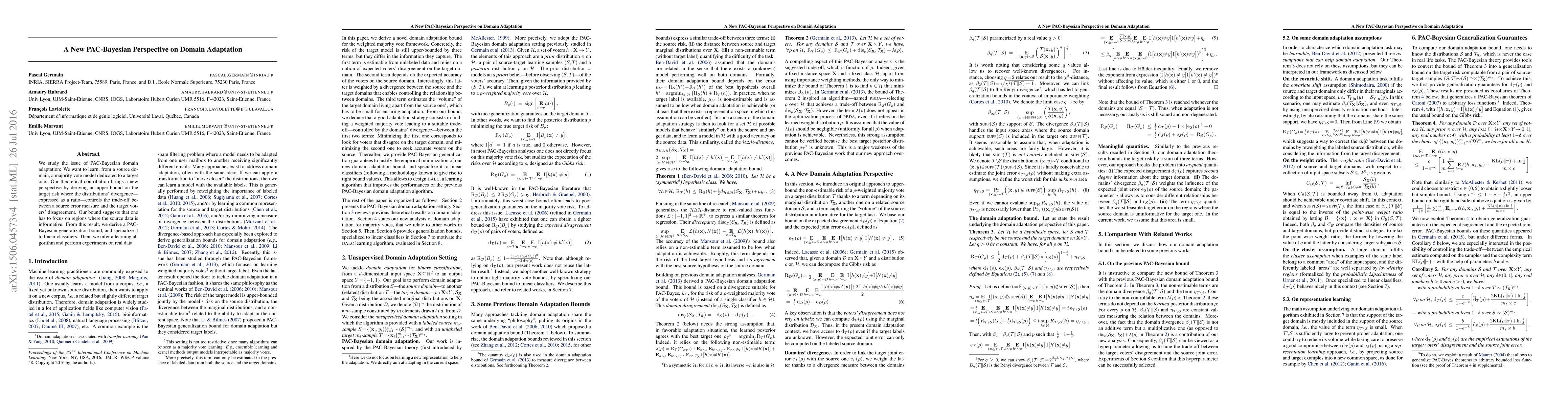 This paper introduces a novel PAC-Bayesian approach to domain adaptation, deriving an upper-bound on target risk that balances source domain error and target domain disagreement. The authors propose a learning algorithm based on this bound and validate it through experiments on real datasets.