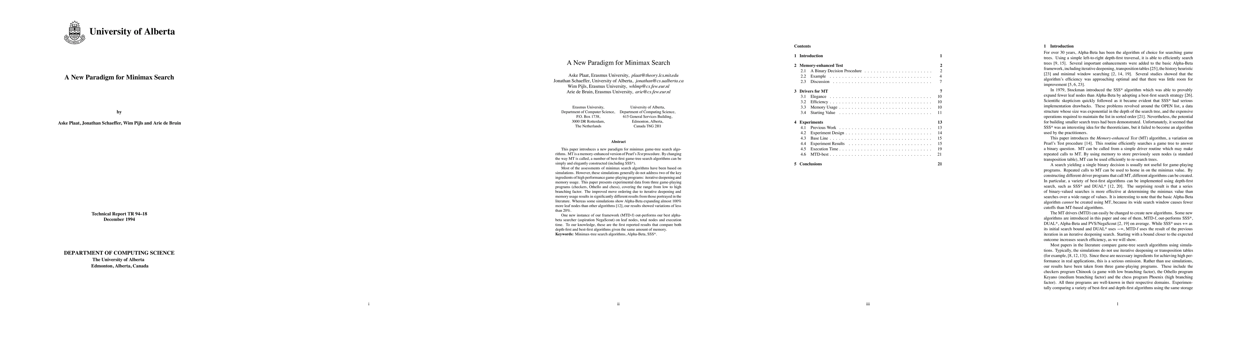 This paper proposes a new memory-enhanced minimax search algorithm, MT, which constructs best-first search algorithms like SSS* and demonstrates improved performance through iterative deepening and memory usage. Experimental results from checkers, Othello, and chess show that MTD-f outperforms traditional alpha-beta algorithms in terms of node expansion, total nodes, and execution time.