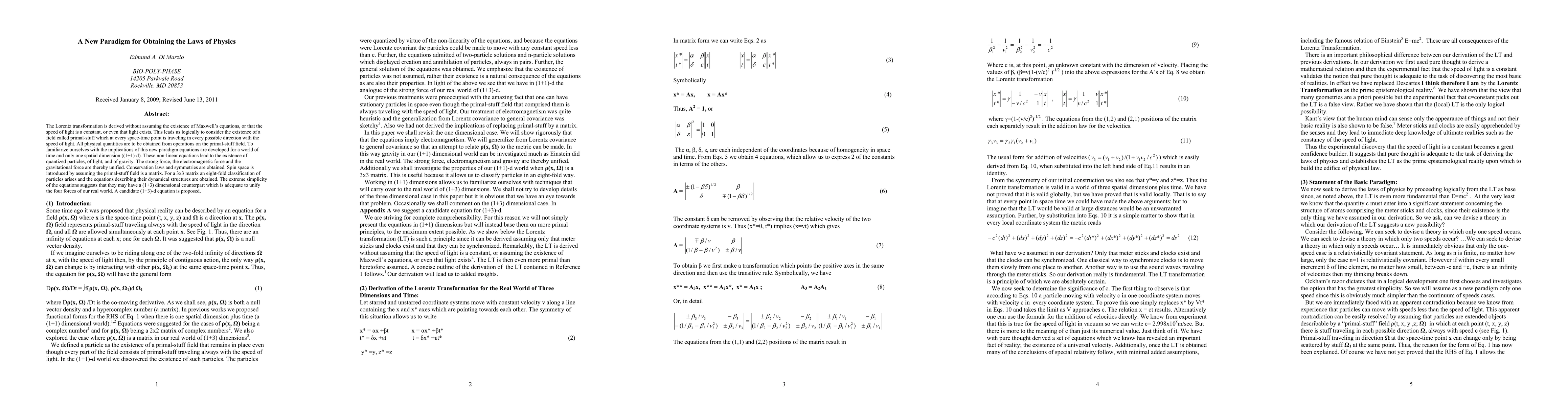 The Lorentz transformation is derived without assuming the existence of Maxwell's equations, or that the speed of light is a constant, or even that light exists. This leads us logically to sonsider the existence of a primal field called stuff which at every space-time point is traveling in every posssible direction with the speed of light. All physical quantities are to be derived from operations on the stuff field. To familiarize ourselves with the implications of the new paradigm equations are developed for a world of time and only one spatial dimension. These non-linear equations lead to the existence of quantized particles, of light, and of gravity. Conservation laws and symmetries are obtained. Spin space is introduced by assuming the stuff field is a matrix. For a 3x3 matrix an eight fold classification of particles arises and the equations describing their dynamical structure are obtained. The extreeme simplicity of the equations suggests that they may have a (1+3) dimensional counterpart which is adequate to unify the four forces of our real world. A candidate (1+3)-d equation is proposed.