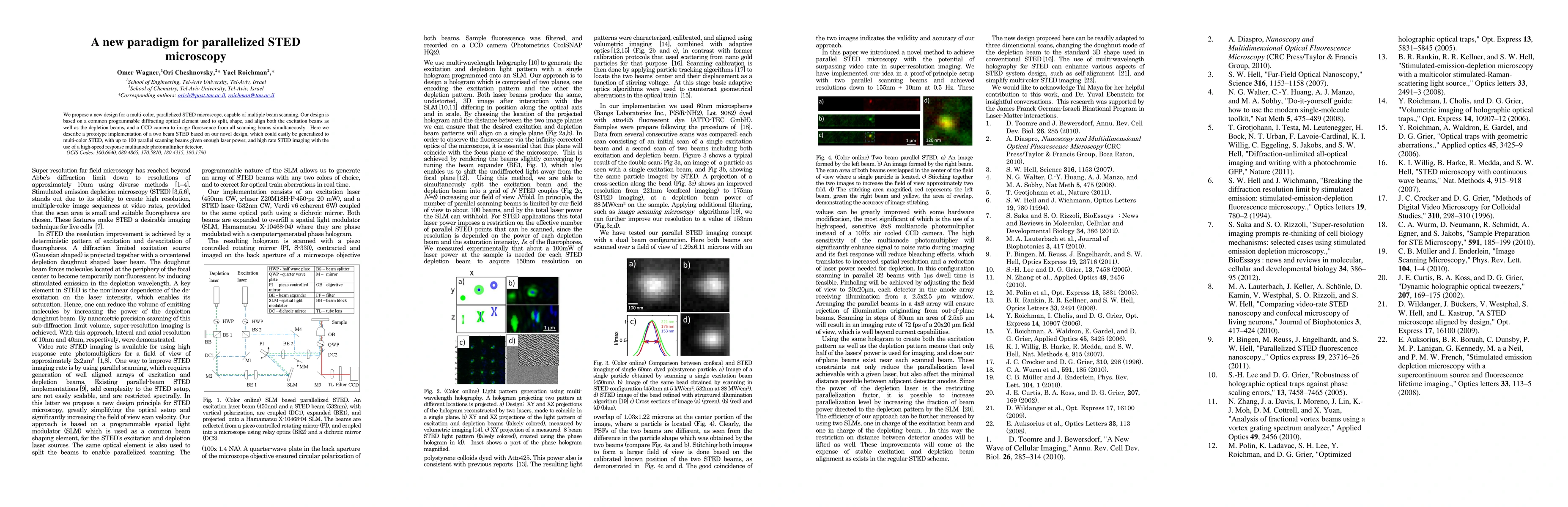 This paper introduces a new design for a multi-color, parallelized STED microscope utilizing a programmable diffracting optical element to manage multiple beams, enabling simultaneous fluorescence imaging. The prototype supports two beams and can be extended to handle up to 100 beams with sufficient laser power.