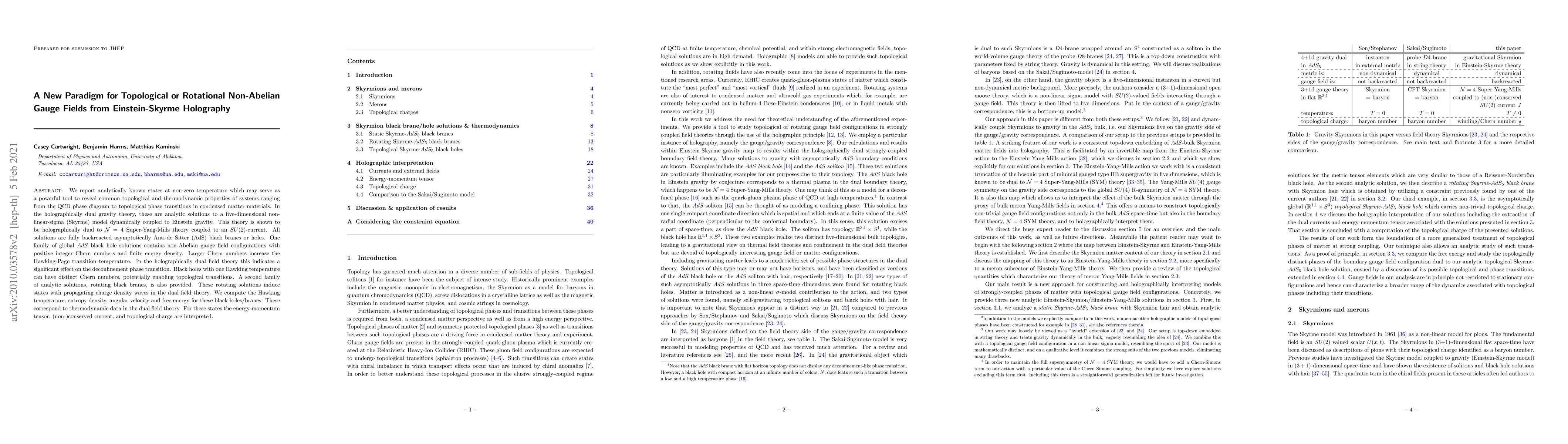 This paper presents analytic solutions to a five-dimensional Skyrme model coupled to Einstein gravity, revealing topological and thermodynamic properties of systems from QCD to condensed matter. The solutions describe non-Abelian gauge fields with distinct Chern numbers, influencing phase transitions in the dual field theory.