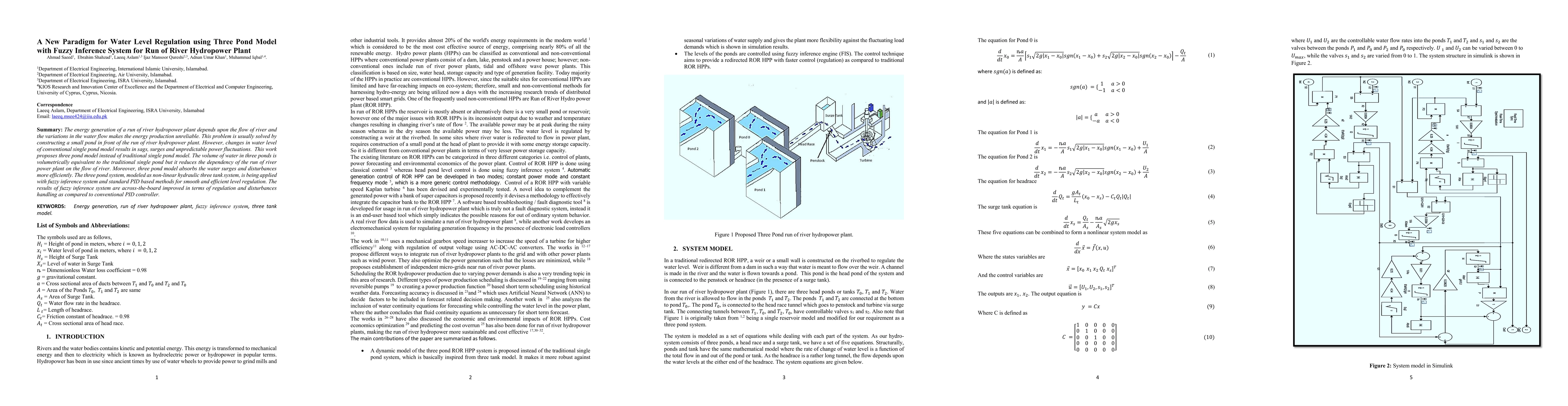 The energy generation of a run of river hydropower plant depends upon the flow of river and the variations in the water flow makes the energy production unreliable. This problem is usually solved by constructing a small pond in front of the run of river hydropower plant. However, changes in water level of conventional single pond model results in sags, surges and unpredictable power fluctuations. This work proposes three pond model instead of traditional single pond model. The volume of water in three ponds is volumetrically equivalent to the traditional single pond but it reduces the dependency of the run of river power plant on the flow of river. Moreover, three pond model absorbs the water surges and disturbances more efficiently. The three pond system, modeled as non-linear hydraulic three tank system, is being applied with fuzzy inference system and standard PID based methods for smooth and efficient level regulation. The results of fuzzy inference system are across-the-board improved in terms of regulation and disturbances handling as compared to conventional PID controller.