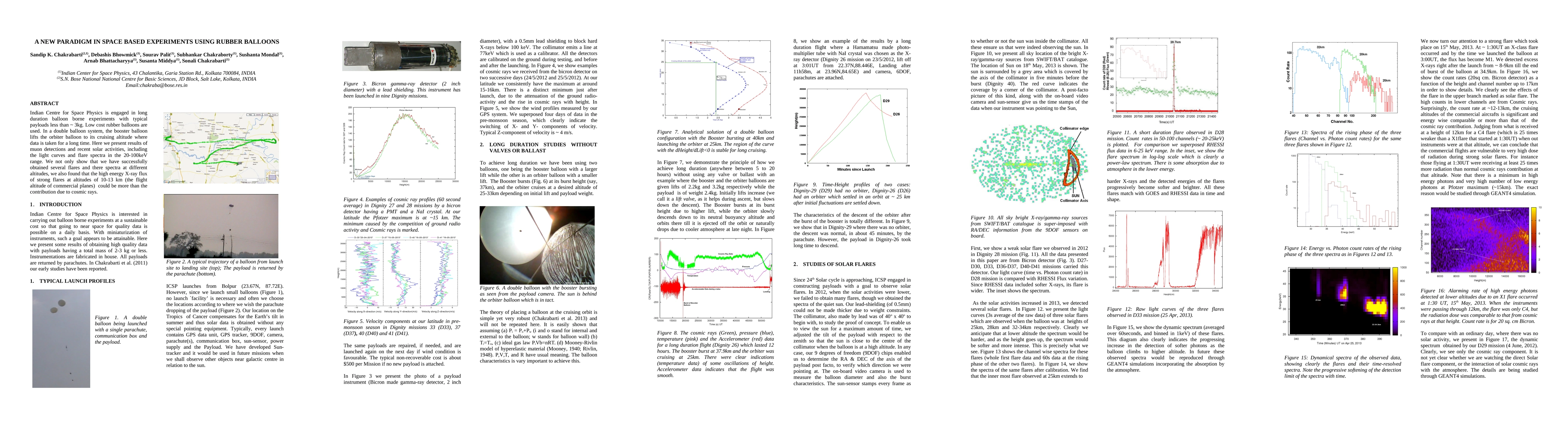 Indian Centre for Space Physics is engaged in long duration balloon borne experiments with typical payloads less than ~ 3kg. Low cost rubber balloons are used. In a double balloon system, the booster balloon lifts the orbiter balloon to its cruising altitude where data is taken for a long time. Here we present results of muon detections and recent solar activities, including the light curves and flare spectra in the 20-100keV range. We not only show that we have successfully obtained several flares and there spectra at different altitudes, we also found that the high energy X-ray flux of strong flares at altitudes of 10-13 km (the flight altitude of commercial planes) could be more than the contribution due to cosmic rays.