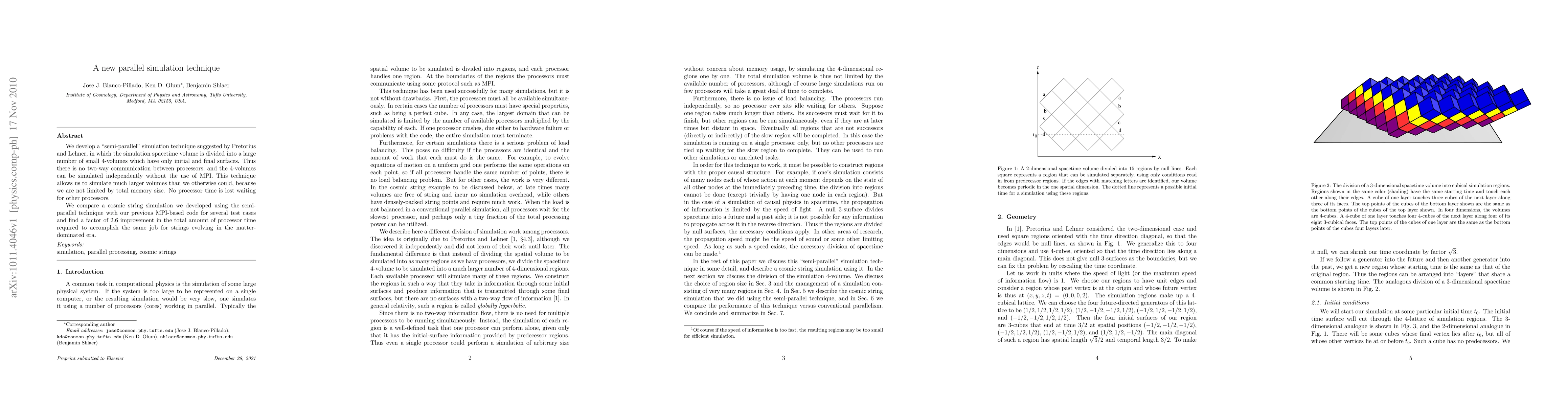 We develop a "semi-parallel" simulation technique suggested by Pretorius and Lehner, in which the simulation spacetime volume is divided into a large number of small 4-volumes which have only initial and final surfaces. Thus there is no two-way communication between processors, and the 4-volumes can be simulated independently without the use of MPI. This technique allows us to simulate much larger volumes than we otherwise could, because we are not limited by total memory size. No processor time is lost waiting for other processors. We compare a cosmic string simulation we developed using the semi-parallel technique with our previous MPI-based code for several test cases and find a factor of 2.6 improvement in the total amount of processor time required to accomplish the same job for strings evolving in the matter-dominated era.