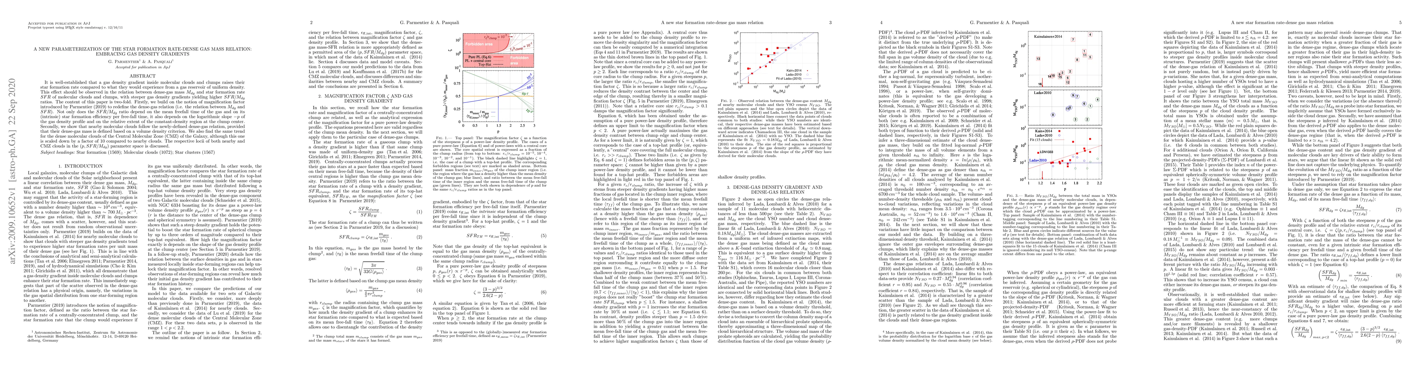 It is well-established that a gas density gradient inside molecular clouds and clumps raises their star formation rate compared to what they would experience from a gas reservoir of uniform density. This effect should be observed in the relation between dense-gas mass $M_{dg}$ and star formation rate $SFR$ of molecular clouds and clumps, with steeper gas density gradients yielding higher $SFR/M_{dg}$ ratios. The content of this paper is two-fold. Firstly, we build on the notion of magnification factor introduced by Parmentier (2019) to redefine the dense-gas relation (i.e. the relation between $M_{dg}$ and $SFR$). Not only does the $SFR/M_{dg}$ ratio depend on the mean free-fall time of the gas and on its (intrinsic) star formation efficiency per free-fall time, it also depends on the logarithmic slope $-p$ of the gas density profile and on the relative extent of the constant-density region at the clump center. Secondly, we show that nearby molecular clouds follow the newly-defined dense-gas relation, provided that their dense-gas mass is defined based on a volume density criterion. We also find the same trend for the dense molecular clouds of the Central Molecular Zone (CMZ) of the Galaxy, although this one is scaled down by a factor of $10$ compared to nearby clouds. The respective locii of both nearby and CMZ clouds in the $(p, SFR/M_{dg})$ parameter space is discussed.