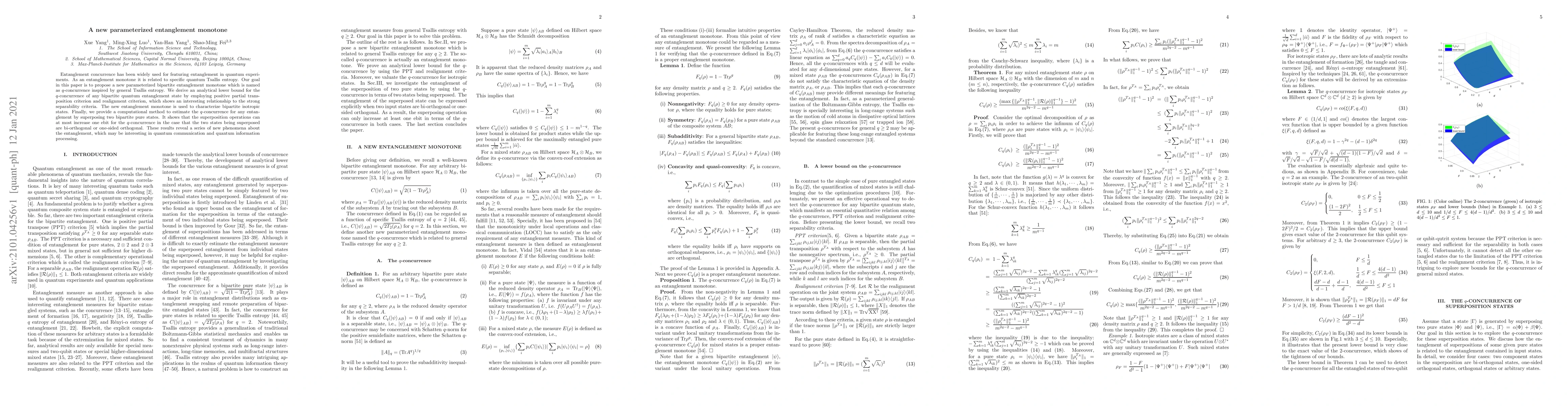 Entanglement concurrence has been widely used for featuring entanglement in quantum experiments. As an entanglement monotone it is related to specific quantum Tsallis entropy. Our goal in this paper is to propose a new parameterized bipartite entanglement monotone which is named as $q$-concurrence inspired by general Tsallis entropy. We derive an analytical lower bound for the $q$-concurrence of any bipartite quantum entanglement state by employing positive partial transposition criterion and realignment criterion, which shows an interesting relationship to the strong separability criteria. The new entanglement monotone is used to characterize bipartite isotropic states. Finally, we provide a computational method to estimate the $q$-concurrence for any entanglement by superposing two bipartite pure states. It shows that the superposition operations can at most increase one ebit for the $q$-concurrence in the case that the two states being superposed are bi-orthogonal or one-sided orthogonal. These results reveal a series of new phenomena about the entanglement, which may be interesting in quantum communication and quantum information processing.