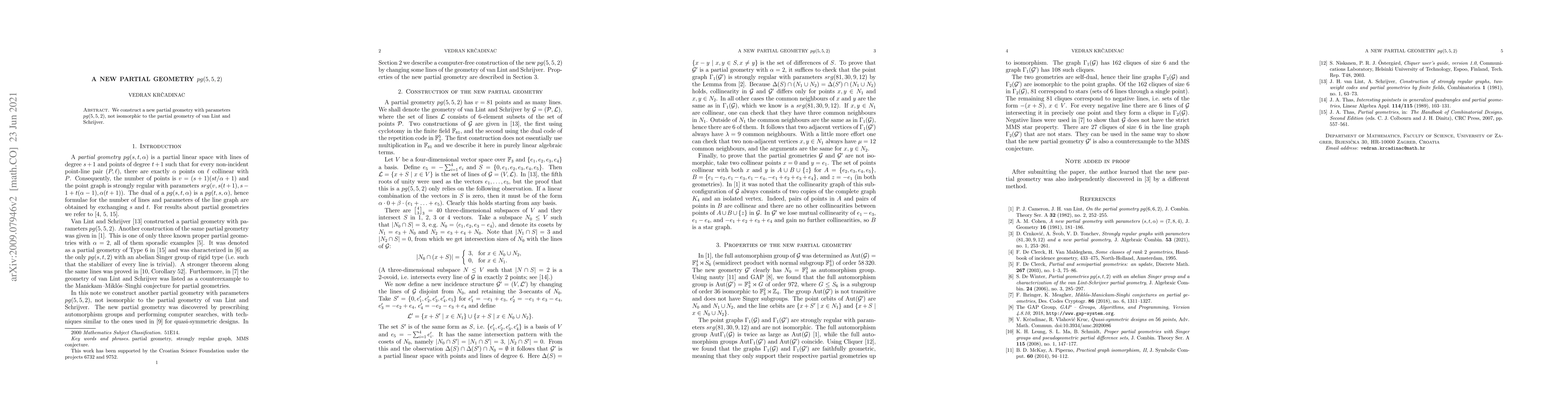 Summary: This paper introduces a novel partial geometry with parameters pg(5,5,2), distinct from the previously known partial geometry by van Lint and Schrijver, offering a new structure in geometric design theory.