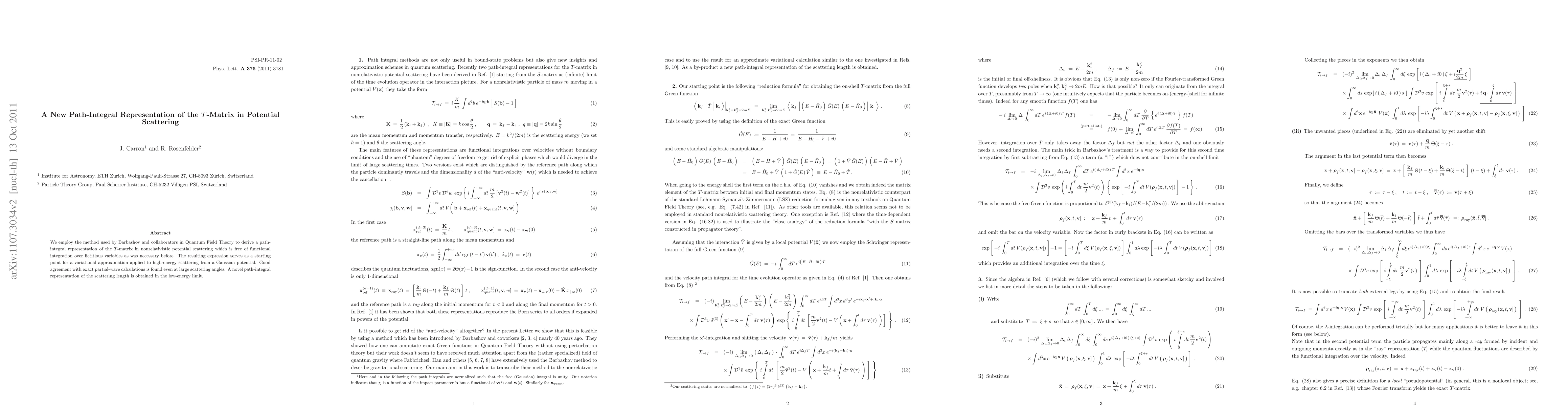This paper introduces a new path-integral representation of the $T$-matrix for nonrelativistic potential scattering, eliminating the need for functional integration over fictitious variables. The derived expression is used for variational approximations in high-energy scattering scenarios, showing good agreement with exact calculations, and it also yields a novel path-integral representation of the scattering length at low energies.