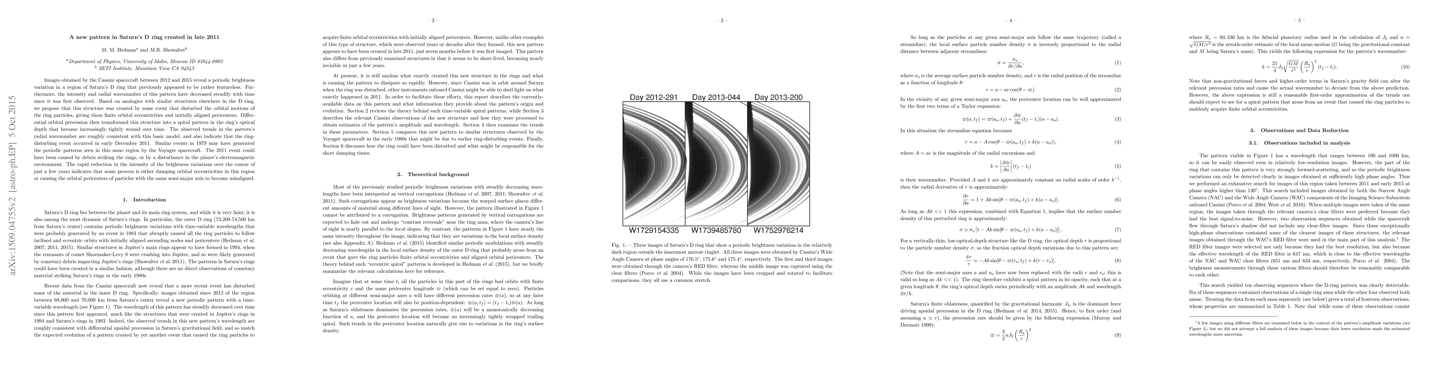 Images obtained by the Cassini spacecraft between 2012 and 2015 reveal a periodic brightness variation in a region of Saturn's D ring that previously appeared to be rather featureless. Furthermore, the intensity and radial wavenumber of this pattern have decreased steadily with time since it was first observed. Based on analogies with similar structures elsewhere in the D ring, we propose that this structure was created by some event that disturbed the orbital motions of the ring particles, giving them finite orbital eccentricities and initially aligned pericenters. Differential orbital precession then transformed this structure into a spiral pattern in the ring's optical depth that became increasingly tightly wound over time. The observed trends in the pattern's radial wavenumber are roughly consistent with this basic model, and also indicate that the ring-disturbing event occurred in early December 2011. Similar events in 1979 may have generated the periodic patterns seen in this same region by the Voyager spacecraft. The 2011 event could have been caused by debris striking the rings, or by a disturbance in the planet's electromagnetic environment. The rapid reduction in the intensity of the brightness variations over the course of just a few years indicates that some process is either damping orbital eccentricities in this region or causing the orbital pericenters of particles with the same semi-major axis to become misaligned.
