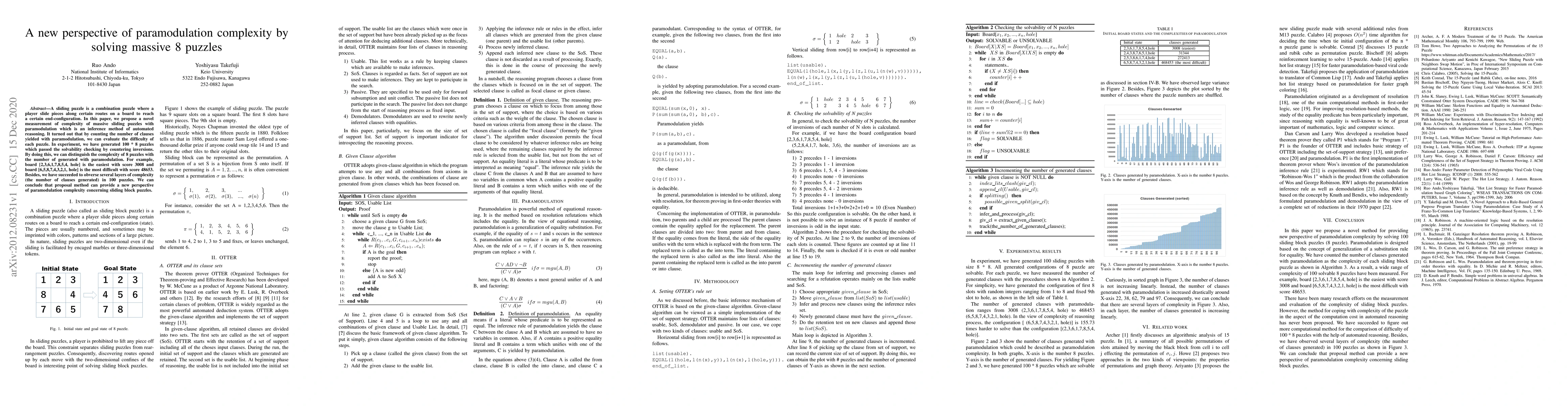 This paper introduces a novel complexity measurement for massive 8-puzzles using paramodulation, an automated reasoning method. By counting the number of clauses generated through paramodulation, the authors evaluate puzzle difficulty, distinguishing complexities in 100 generated puzzles, with scores ranging from 3008 to 48653.