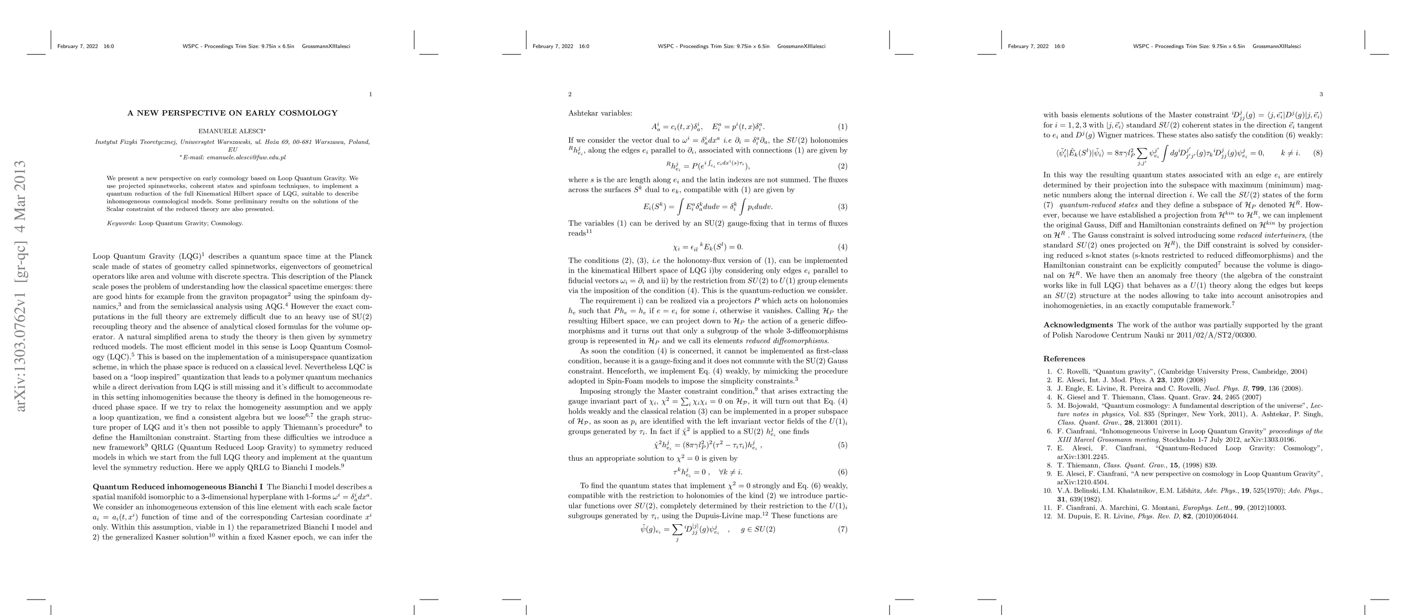 We present a new perspective on early cosmology based on Loop Quantum Gravity. We use projected spinnetworks, coherent states and spinfoam techniques, to implement a quantum reduction of the full Kinematical Hilbert space of LQG, suitable to describe inhomogeneous cosmological models. Some preliminary results on the solutions of the Scalar constraint of the reduced theory are also presented.
