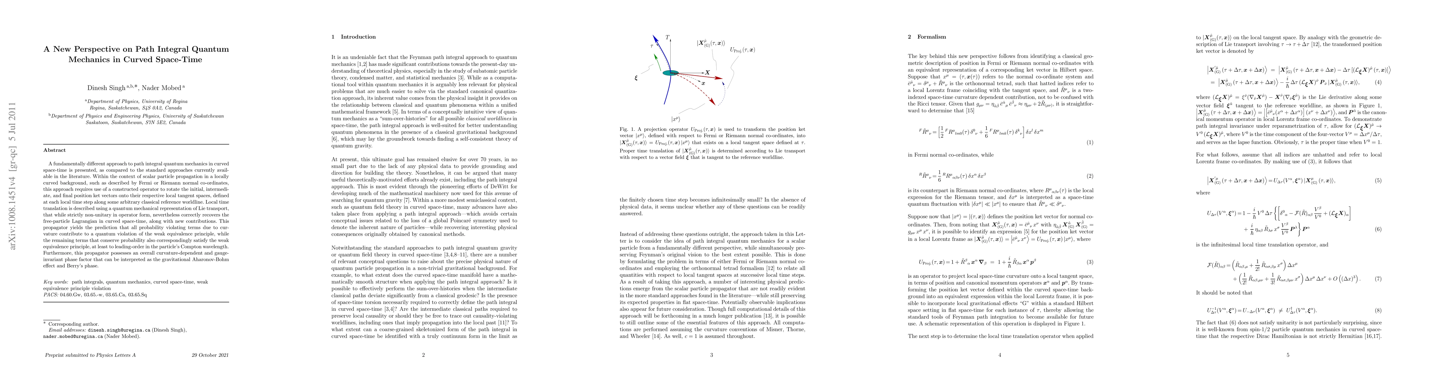 A fundamentally different approach to path integral quantum mechanics in curved space-time is presented, as compared to the standard approaches currently available in the literature. Within the context of scalar particle propagation in a locally curved background, such as described by Fermi or Riemann normal co-ordinates, this approach requires use of a constructed operator to rotate the initial, intermediate, and final position ket vectors onto their respective local tangent spaces, defined at each local time step along some arbitrary classical reference worldline. Local time translation is described using a quantum mechanical representation of Lie transport, that while strictly non-unitary in operator form, nevertheless correctly recovers the free-particle Lagrangian in curved space-time, along with new contributions. This propagator yields the prediction that all probability violating terms due to curvature contribute to a quantum violation of the weak equivalence principle, while the remaining terms that conserve probability also correspondingly satisfy the weak equivalence principle, at least to leading-order in the particle's Compton wavelength. Furthermore, this propagator possesses an overall curvature-dependent and gauge-invariant phase factor that can be interpreted as the gravitational Aharonov-Bohm effect and Berry's phase.
