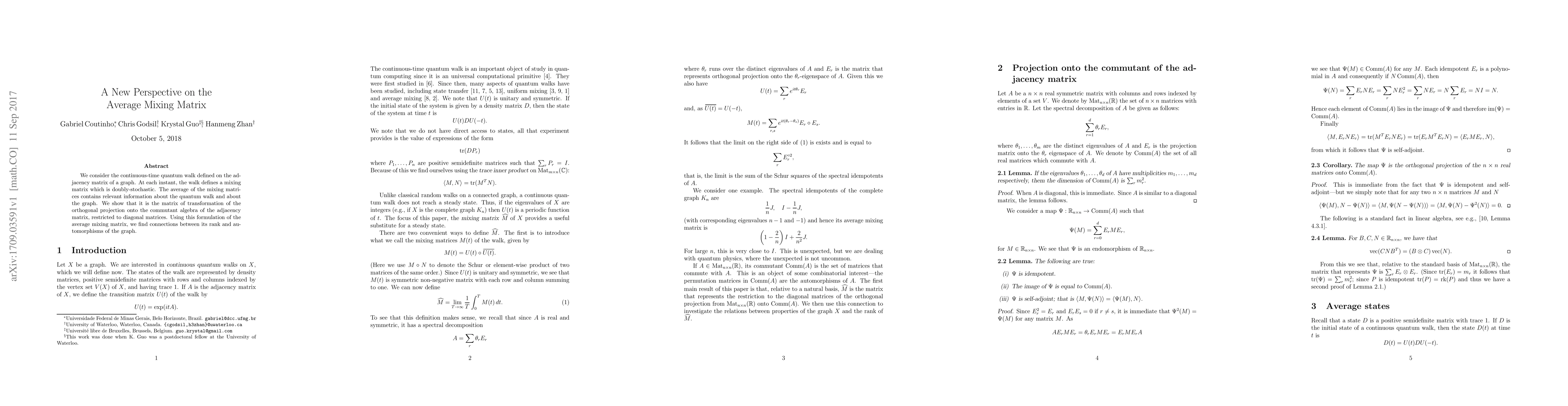 We consider the continuous-time quantum walk defined on the adjacency matrix of a graph. At each instant, the walk defines a mixing matrix which is doubly-stochastic. The average of the mixing matrices contains relevant information about the quantum walk and about the graph. We show that it is the matrix of transformation of the orthogonal projection onto the commutant algebra of the adjacency matrix, restricted to diagonal matrices. Using this formulation of the average mixing matrix, we find connections between its rank and automorphisms of the graph.