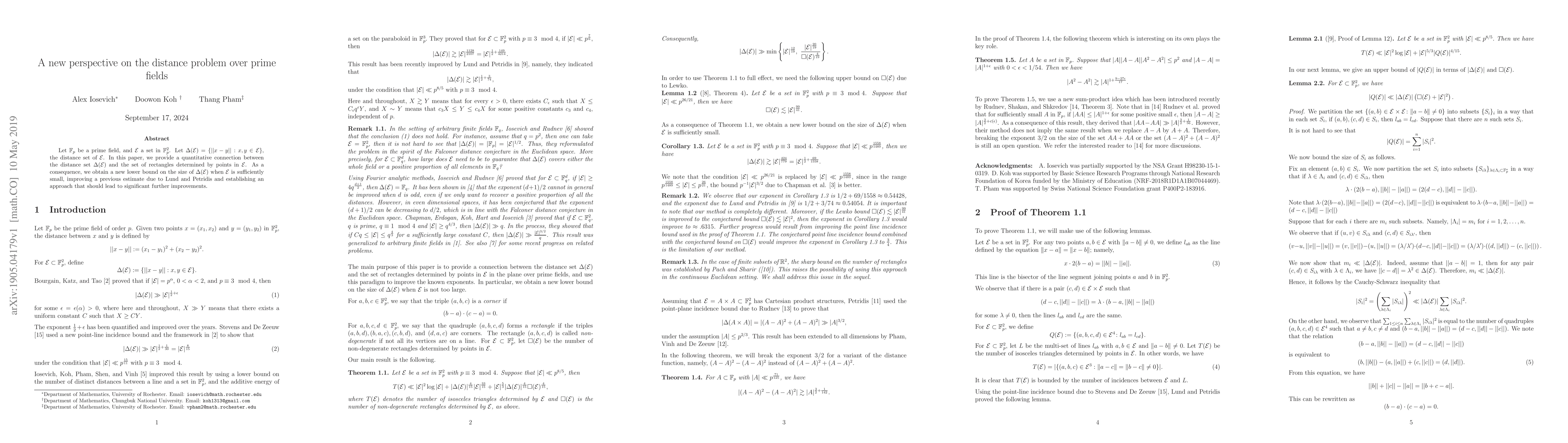 Let $\mathbb{F}_p$ be a prime field, and ${\mathcal E}$ a set in $\mathbb{F}_p^2$. Let $\Delta({\mathcal E})=\{||x-y||: x,y \in {\mathcal E} \}$, the distance set of ${\mathcal E}$. In this paper, we provide a quantitative connection between the distance set $\Delta({\mathcal E})$ and the set of rectangles determined by points in ${\mathcal E}$. As a consequence, we obtain a new lower bound on the size of $\Delta({\mathcal E})$ when ${\mathcal E}$ is not too large, improving a previous estimate due to Lund and Petridis and establishing an approach that should lead to significant further improvements.