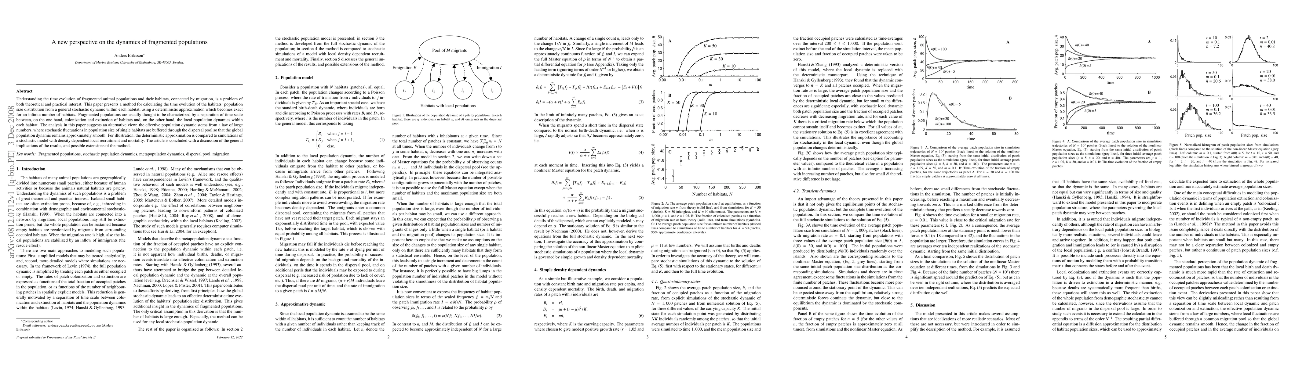 A new method calculates the time evolution of fragmented populations' habitats, suggesting a smoother global population dynamic due to stochastic fluctuations being buffered through dispersal pools. This challenges traditional views on habitat colonization and extinction timescales.
