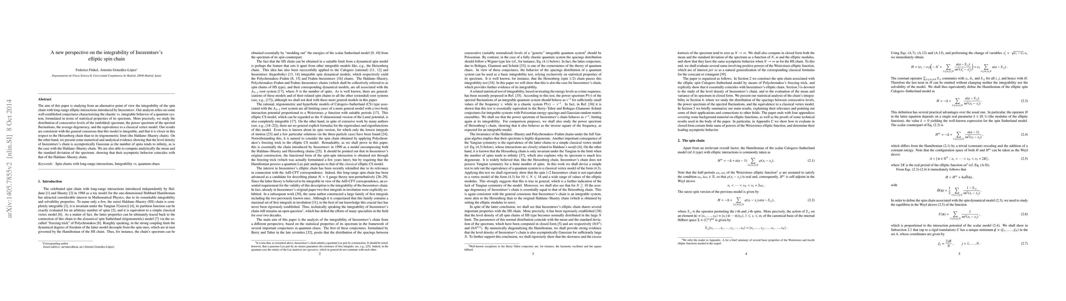 The aim of this paper is studying from an alternative point of view the integrability of the spin chain with long-range elliptic interactions introduced by Inozemtsev. Our analysis relies on some well-established conjectures characterizing the chaotic vs. integrable behavior of a quantum system, formulated in terms of statistical properties of its spectrum. More precisely, we study the distribution of consecutive levels of the (unfolded) spectrum, the power spectrum of the spectral fluctuations, the average degeneracy, and the equivalence to a classical vertex model. Our results are consistent with the general consensus that this model is integrable, and that it is closer in this respect to the Heisenberg chain than to its trigonometric limit (the Haldane-Shastry chain). On the other hand, we present some numerical and analytical evidence showing that the level density of Inozemtsev's chain is asymptotically Gaussian as the number of spins tends to infinity, as is the case with the Haldane-Shastry chain. We are also able to compute analytically the mean and the standard deviation of the spectrum, showing that their asymptotic behavior coincides with that of the Haldane-Shastry chain.