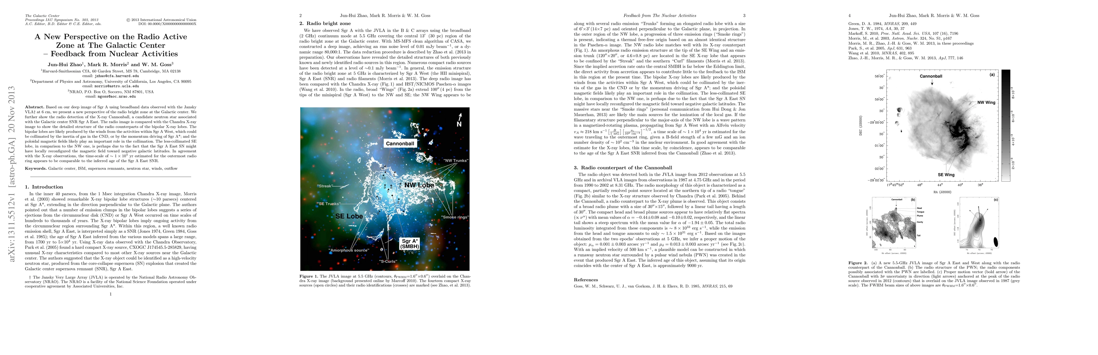 Based on our deep image of Sgr A using broadband data observed with the Jansky VLA at 6 cm, we present a new perspective of the radio bright zone at the Galactic center. We further show the radio detection of the X-ray Cannonball, a candidate neutron star associated with the Galactic center SNR Sgr A East. The radio image is compared with the Chandra X-ray image to show the detailed structure of the radio counterparts of the bipolar X-ray lobes. The bipolar lobes are likely produced by the winds from the activities within Sgr A West, which could be collimated by the inertia of gas in the CND, or by the momentum driving of Sgr A*; and the poloidal magnetic fields likely play an important role in the collimation. The less-collimated SE lobe, in comparison to the NW one, is perhaps due to the fact that the Sgr A East SN might have locally reconfigured the magnetic field toward negative galactic latitudes. In agreement with the X-ray observations, the time-scale of ~ $1\times10^4$ yr estimated for the outermost radio ring appears to be comparable to the inferred age of the Sgr A East SNR.