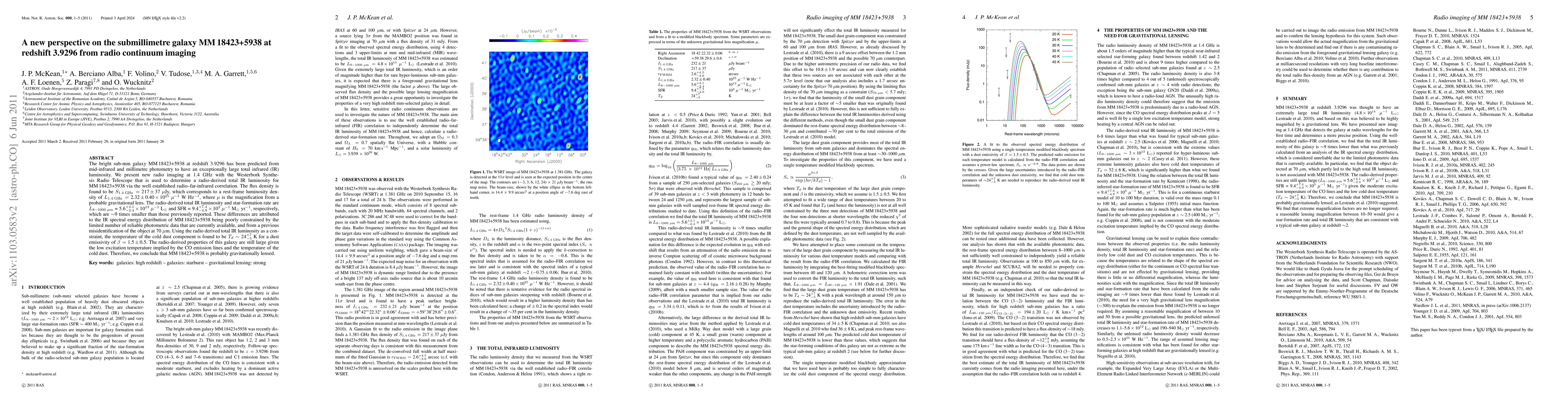 The bright submillimetre (sub-mm) galaxy MM 18423+5938 at redshift 3.9296 has been predicted from mid-infrared and millimetre photometry to have an exceptionally large total infrared (IR) luminosity. We present new radio imaging at 1.4 GHz with the Westerbork Synthesis Radio Telescope that is used to determine a radio-derived total IR luminosity for MM 18423+5938 via the well established radio-far-infrared correlation. The flux density is found to be S_1.4 GHz = 217 +/- 37 \mu Jy, which corresponds to a rest-frame luminosity density of L_1.4 GHz = 2.32 +/- 0.40 x 10^25 / u W / Hz, where u is the magnification from a probable gravitational lens. The radio-derived total IR luminosity and star-formation rate are L_8-1000 \mu m = 5.6^+4.1_-2.4 x 10^13 / u L_sol and SFR = 9.4^+7.4_-4.9 x 10^3 / u M_sol / yr, respectively, which are ~9 times smaller than those previously reported. These differences are attributed to the IR spectral energy distribution of MM 18423+5938 being poorly constrained by the limited number of reliable photometric data that are currently available, and from a previous misidentification of the object at 70 \mu m. Using the radio derived total IR luminosity as a constraint, the temperature of the cold dust component is found to be T ~ 24^+7_-5 K for a dust emissivity of \beta = 1.5 +/- 0.5. The radio-derived properties of this galaxy are still large given the low excitation temperature implied by the CO emission lines and the temperature of the cold dust. Therefore, we conclude that MM 18423+5938 is probably gravitationally lensed.