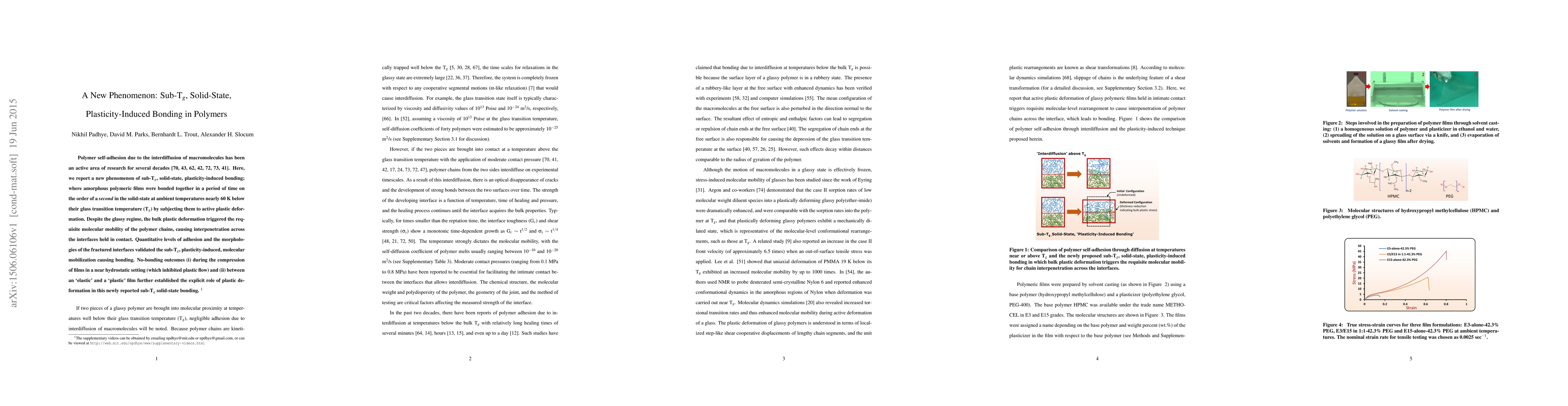 Polymer self-adhesion due to the interdiffusion of macromolecules has been an active area of research for several decades [70, 43, 62, 42, 72, 73, 41]. Here, we report a new phenomenon of sub-Tg, solid-state, plasticity-induced bonding; where amorphous polymeric films were bonded together in a period of time on the order of a second in the solid-state at ambient temperatures nearly 60 K below their glass transition temperature (Tg) by subjecting them to active plastic deformation. Despite the glassy regime, the bulk plastic deformation triggered the requisite molecular mobility of the polymer chains, causing interpenetration across the interfaces held in contact. Quantitative levels of adhesion and the morphologies of the fractured interfaces validated the sub-Tg, plasticity-induced, molecular mobilization causing bonding. No-bonding outcomes (i) during the compression of films in a near hydrostatic setting (which inhibited plastic flow) and (ii) between an 'elastic' and a 'plastic' film further established the explicit role of plastic deformation in this newly reported sub-Tg solid-state bonding .