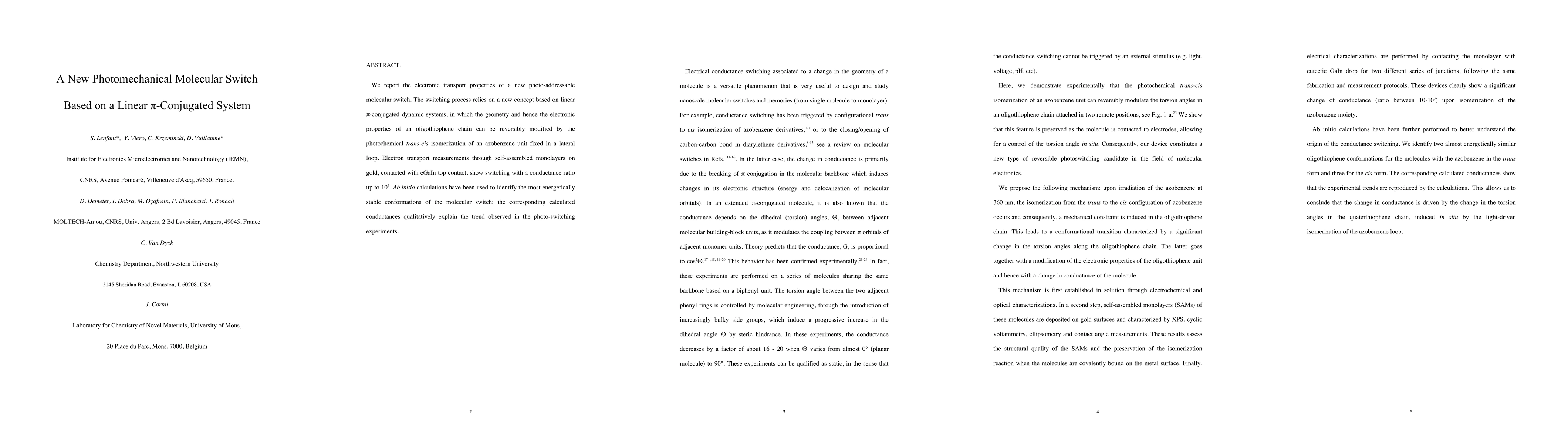 This paper introduces a novel photomechanical molecular switch based on a linear π-conjugated system, where the conductance can be reversibly altered by photochemical trans-cis isomerization of an azobenzene unit. Electron transport measurements reveal a conductance ratio up to 1000, supported by ab initio calculations.