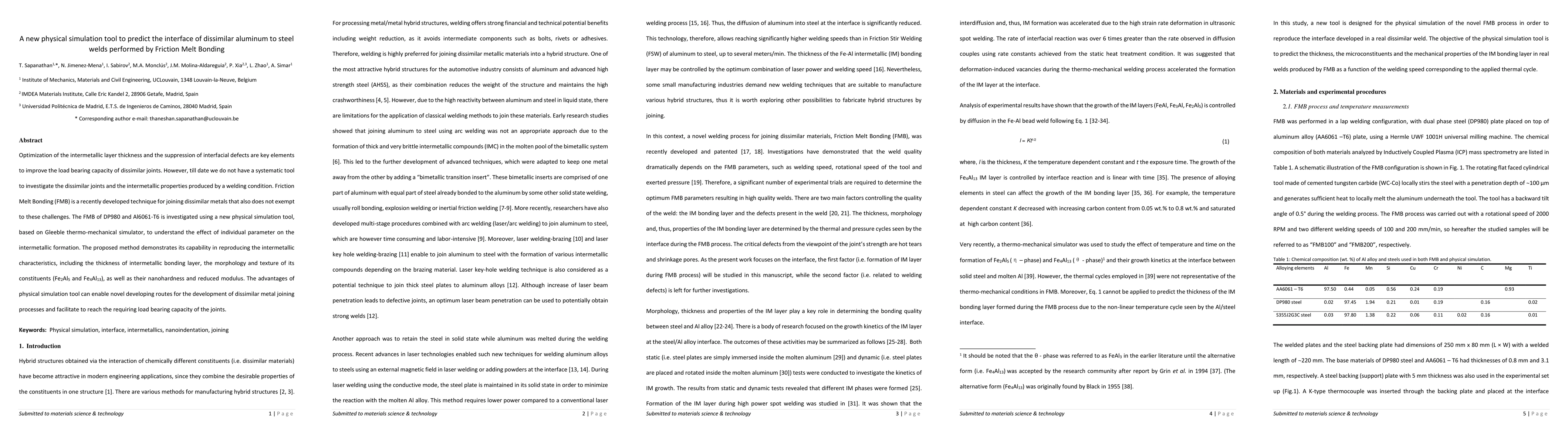 Optimization of the intermetallic layer thickness and the suppression of interfacial defects are key elements to improve the load bearing capacity of dissimilar joints. However, till date we do not have a systematic tool to investigate the dissimilar joints and the intermetallic properties produced by a welding condition. Friction Melt Bonding (FMB) is a recently developed technique for joining dissimilar metals that also does not exempt to these challenges. The FMB of DP980 and Al6061-T6 is investigated using a new physical simulation tool, based on Gleeble thermo-mechanical simulator, to understand the effect of individual parameter on the intermetallic formation. The proposed method demonstrates its capability in reproducing the intermetallic characteristics, including the thickness of intermetallic bonding layer, the morphology and texture of its constituents (Fe2Al5 and Fe4Al13), as well as their nanohardness and reduced modulus. The advantages of physical simulation tool can enable novel developing routes for the development of dissimilar metal joining processes and facilitate to reach the requiring load bearing capacity of the joints.