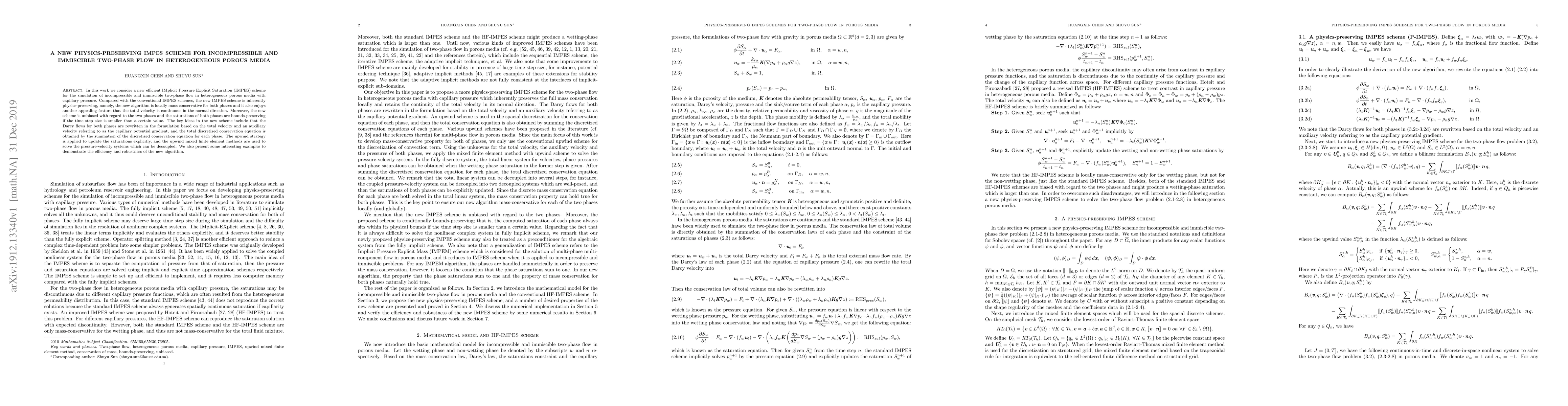 In this work we consider a new efficient IMplicit Pressure Explicit Saturation (IMPES) scheme for the simulation of incompressible and immiscible two-phase flow in heterogeneous porous media with capillary pressure. Compared with the conventional IMPES schemes, the new IMPES scheme is inherently physics-preserving, namely, the new algorithm is locally mass conservative for both phases and it also enjoys another appealing feature that the total velocity is continuous in the normal direction. Moreover, the new scheme is unbiased with regard to the two phases and the saturations of both phases are bounds-preserving if the time step size is smaller than a certain value. The key ideas in the new scheme include that the Darcy flows for both phases are rewritten in the formulation based on the total velocity and an auxiliary velocity referring to as the capillary potential gradient, and the total discretized conservation equation is obtained by the summation of the discretized conservation equation for each phase. The upwind strategy is applied to update the saturations explicitly, and the upwind mixed finite element methods are used to solve the pressure-velocity systems which can be decoupled. We also present some interesting examples to demonstrate the efficiency and robustness of the new algorithm.