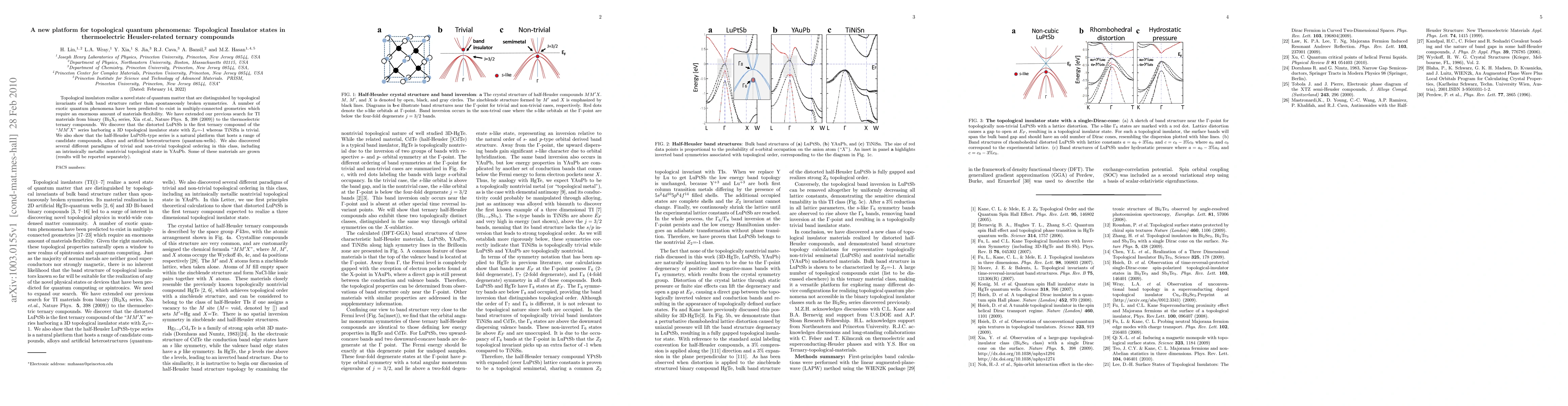 Topological insulators (TI) realize a novel state of quantum matter that are distinguished by topological invariants of bulk band structure rather than spontaneously broken symmetries. A number of exotic quantum phenomena have been predicted to exist in multiply-connected geometries which require an enormous amount of materials flexibility. We have extended our previous search for TI materials from binary (Bi2X3 series) to the thermoelectric ternary compounds. We discover that the distorted LuPtSb is the first ternary compound harboring a 3D topological insulator state. We also show that the half-Heusler LuPtSb-type series is a natural platform that hosts a range of candidate compounds, alloys and artificial heterostructures (quantum-wells). We also discovered several different paradigms of trivial and non-trivial topological ordering in this class, including a metallic nontrivial topological state in YAuPb. Some of these materials are grown (results will be reported separately).