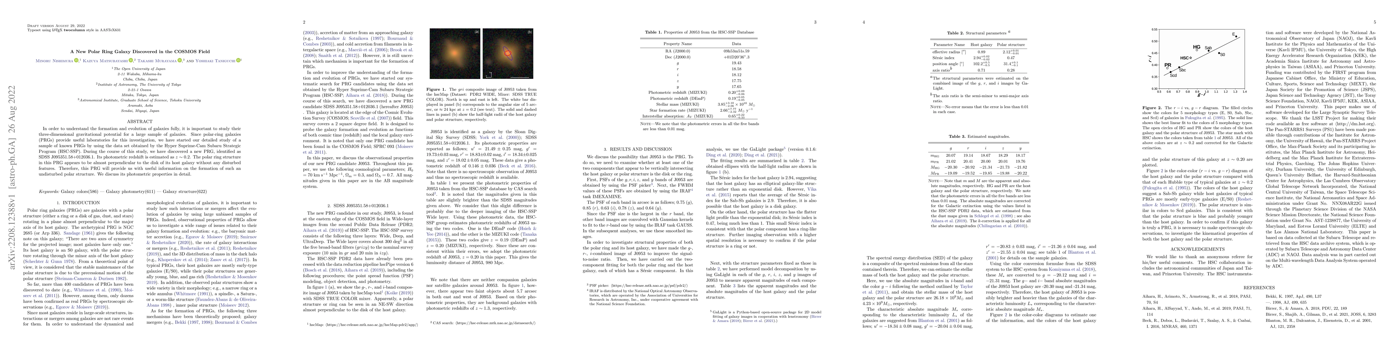 This paper reports the discovery of a new polar-ring galaxy, SDSS J095351.58+012036.1, in the COSMOS field, with a photometric redshift of z ~ 0.2. The polar ring is nearly perpendicular to the host galaxy's disk, offering insights into the formation of undisturbed polar structures.
