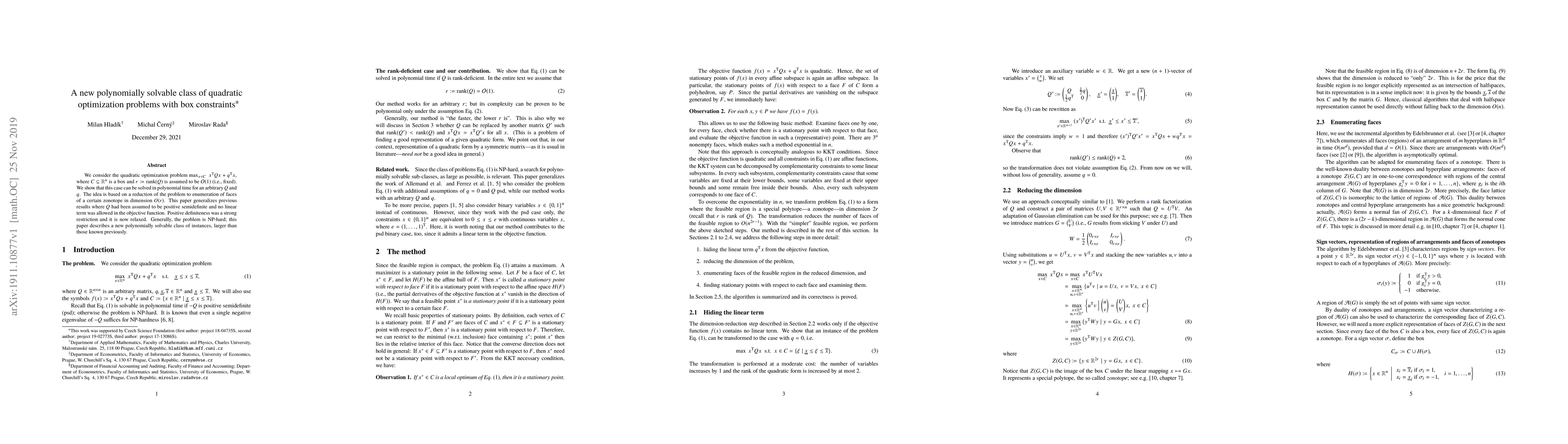 This paper introduces a new class of quadratic optimization problems with box constraints that can be solved in polynomial time, expanding on previous results by relaxing the positive semidefinite assumption and allowing linear terms.