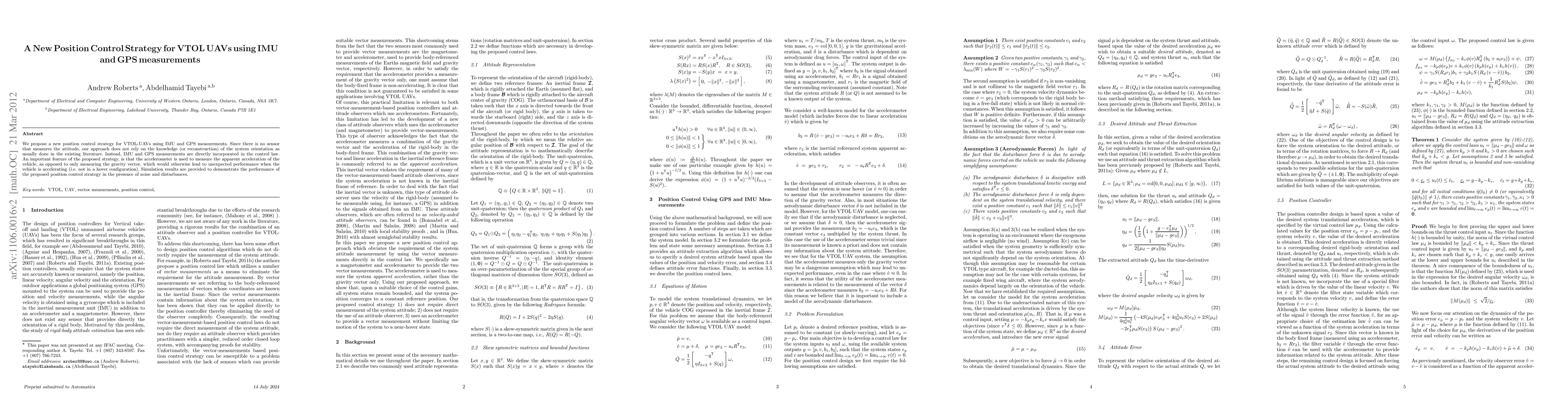 This paper introduces a novel position control strategy for VTOL UAVs that directly uses IMU and GPS measurements without relying on attitude reconstruction. The strategy leverages accelerometer data to measure apparent acceleration, enhancing performance during non-hover states, and is validated through simulation under noise and disturbances.