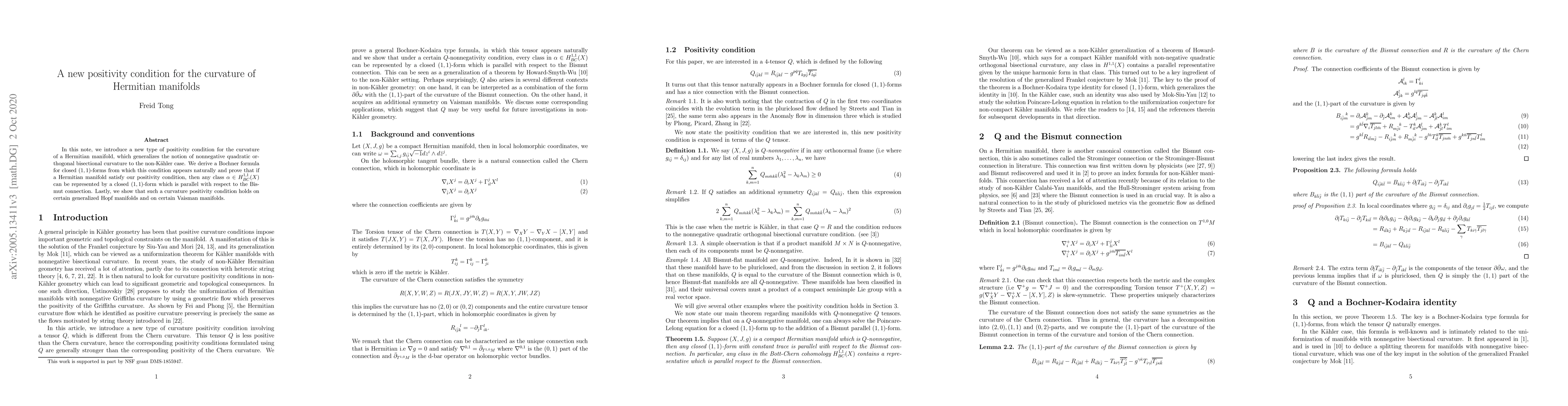 This paper introduces a novel positivity condition for the curvature of Hermitian manifolds, extending the concept of nonnegative quadratic orthogonal bisectional curvature to non-Kähler cases. It demonstrates that satisfying this condition allows for the representation of any class by a parallel closed $(1, 1)$-form with respect to the Bismut connection.