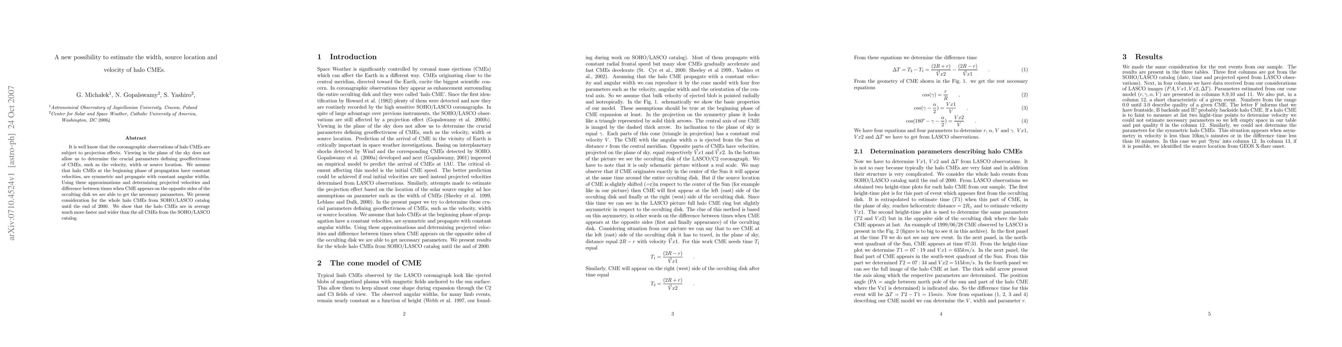 This paper proposes a method to estimate the velocity, width, and source location of halo coronal mass ejections (CMEs) using SOHO/LASCO observations, addressing the limitations of projection effects. The study finds that, on average, halo CMEs are faster and wider than other CMEs in the catalog.
