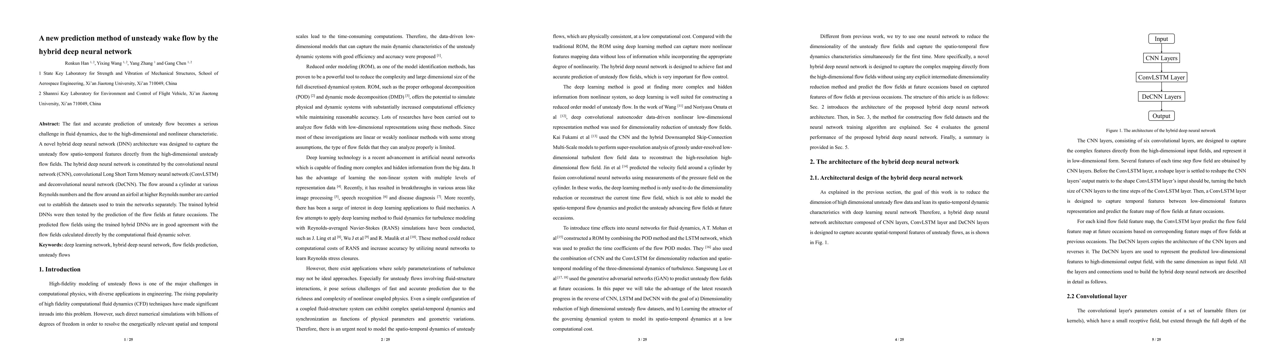This paper proposes a hybrid deep neural network combining CNN, ConvLSTM, and DeCNN for predicting unsteady wake flows. The method is tested on flow around a cylinder and an airfoil, showing accurate predictions compared to computational fluid dynamics simulations.