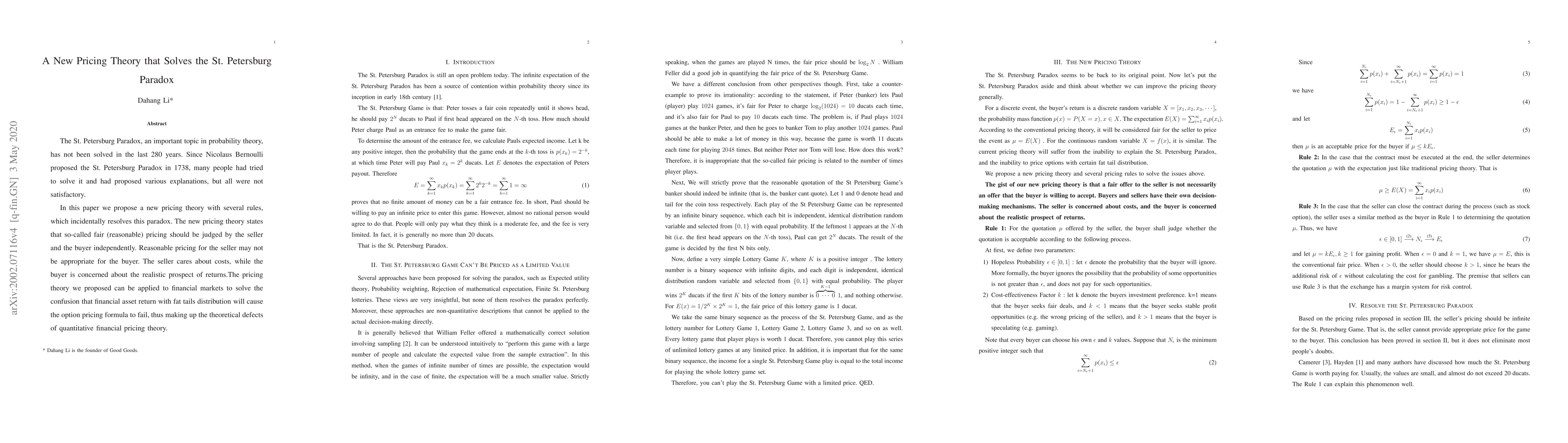 This paper proposes a new pricing theory that resolves the St. Petersburg Paradox by suggesting fair pricing should be judged independently by sellers and buyers, addressing the conflict between cost considerations and realistic return prospects. The theory aims to correct the theoretical defects in quantitative financial pricing, especially in markets with fat-tailed distributions.