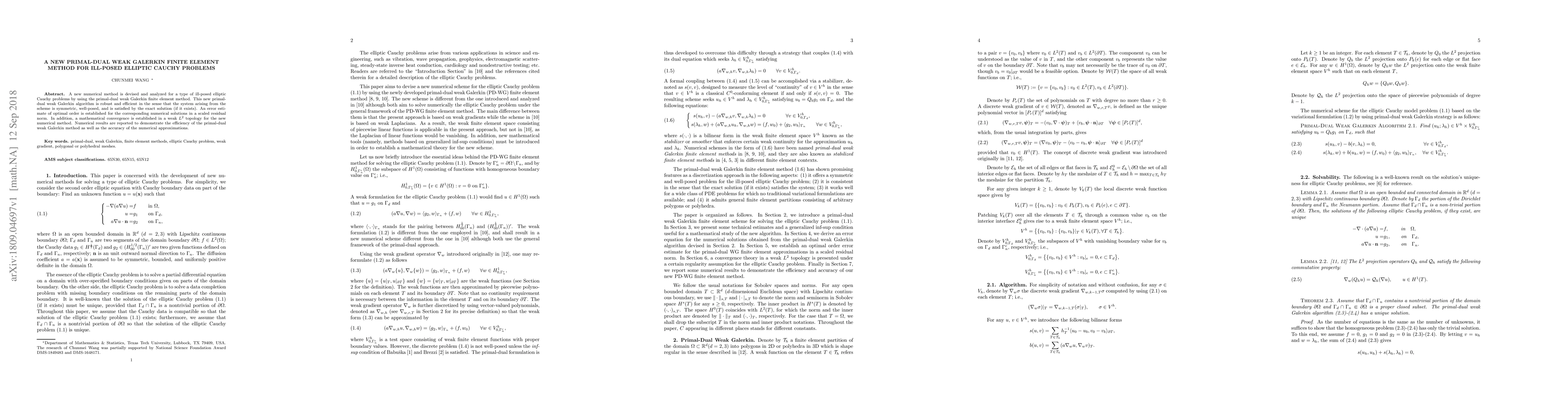 A new numerical method is devised and analyzed for a type of ill-posed elliptic Cauchy problems by using the primal-dual weak Galerkin finite element method. This new primal-dual weak Galerkin algorithm is robust and efficient in the sense that the system arising from the scheme is symmetric, well-posed, and is satisfied by the exact solution (if it exists). An error estimate of optimal order is established for the corresponding numerical solutions in a scaled residual norm. In addition, a mathematical convergence is established in a weak $L^2$ topology for the new numerical method. Numerical results are reported to demonstrate the efficiency of the primal-dual weak Galerkin method as well as the accuracy of the numerical approximations.
