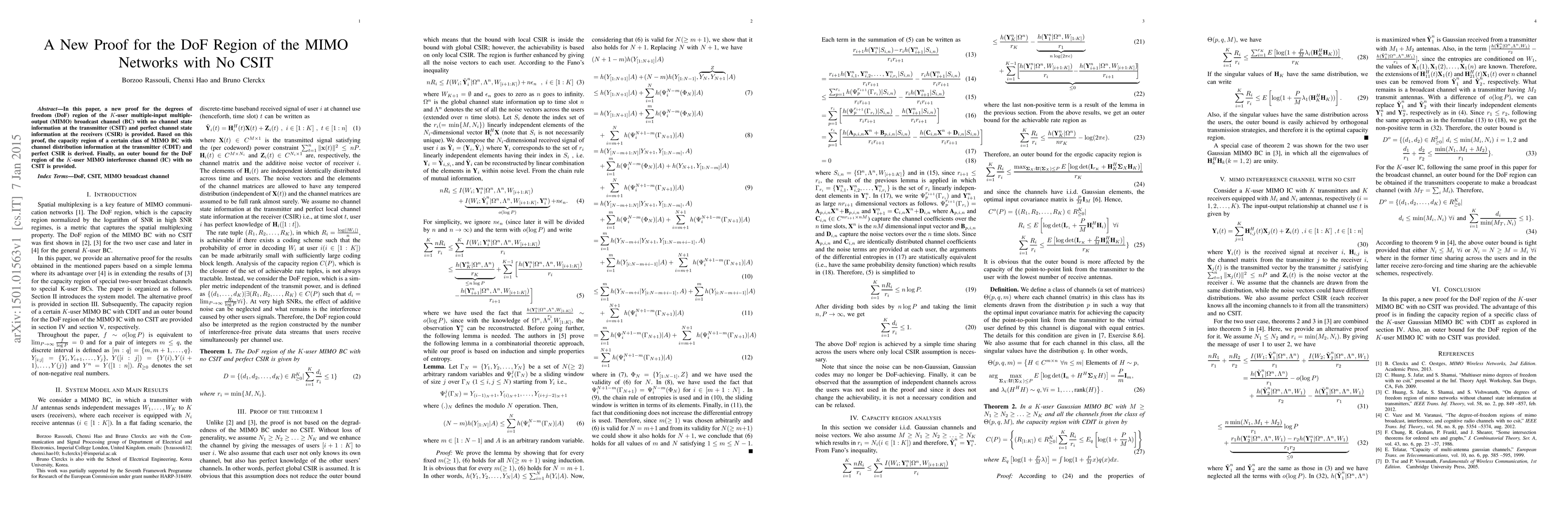 In this paper, a new proof for the degrees of freedom (DoF) region of the K-user multiple-input multiple-output (MIMO) broadcast channel (BC) with no channel state information at the transmitter (CSIT) and perfect channel state information at the receivers (CSIR) is provided. Based on this proof, the capacity region of a certain class of MIMO BC with channel distribution information at the transmitter (CDIT) and perfect CSIR is derived. Finally, an outer bound for the DoF region of the K-user MIMO interference channel (IC) with no CSIT is provided.