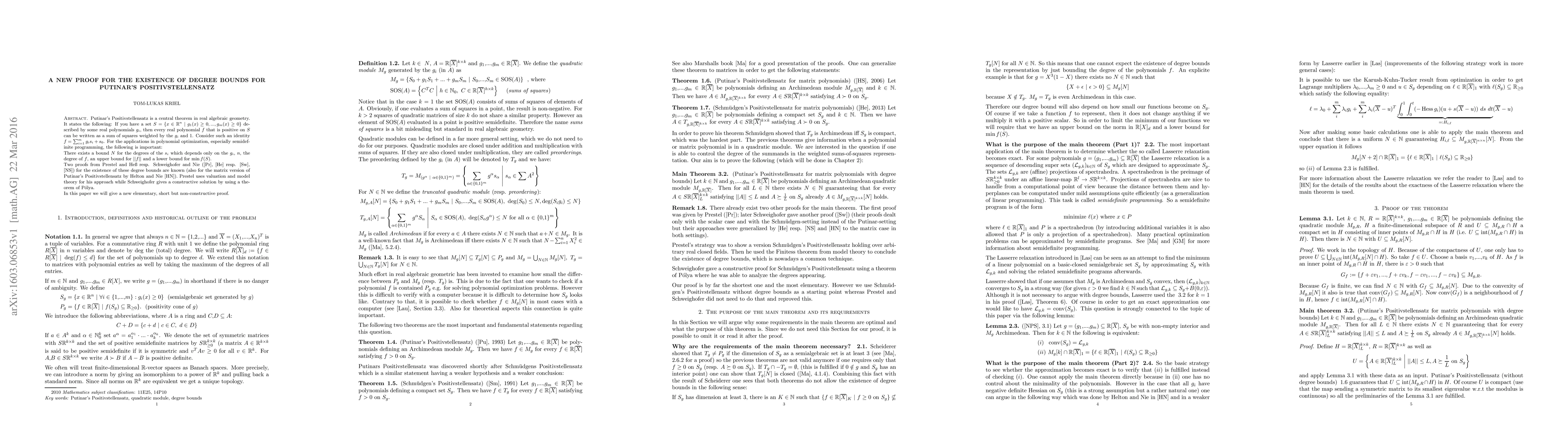 This paper presents a new, concise, and elementary proof for the existence of degree bounds in Putinar's Positivstellensatz, which is crucial for polynomial optimization and semidefinite programming. Unlike previous proofs, this new approach is non-constructive.